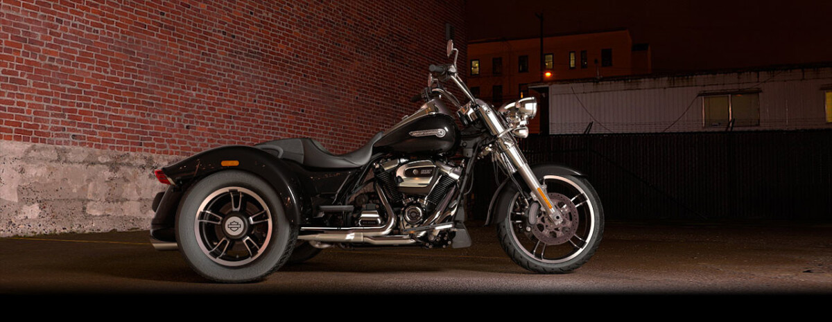 The Freewheeler puts stripped down, custom style into an easy handling frame that lets you roll withthe confidence three wheels gives to a rider. You get classic cruiser lines and styling details, like bobtailrear fenders, slash cut pipes, chrome headlight nacelle, 12-inch mini ape hangers and Enforcer aluminum wheels. You also get enough cargo space to hold two full-face helmets. The acceleration is instant thanks to the low-end torque of the all-new Milwaukee-Eight 107 engine. And the 49mm front forks and adjustable rear suspension make the ride smooth. They say good things come in threes, and Freewheeler is the proof.