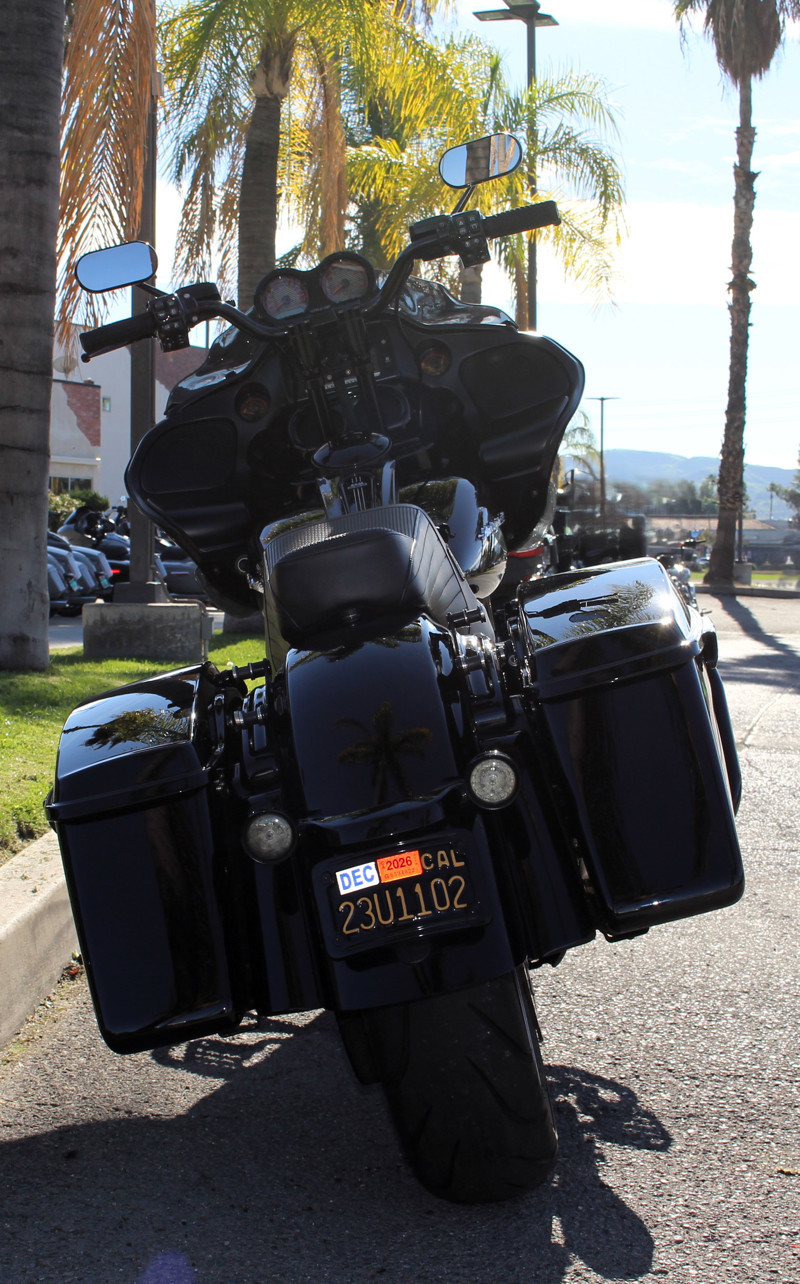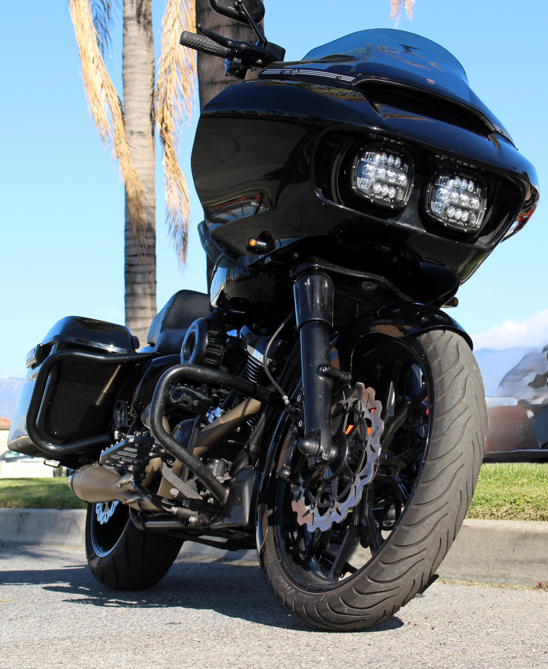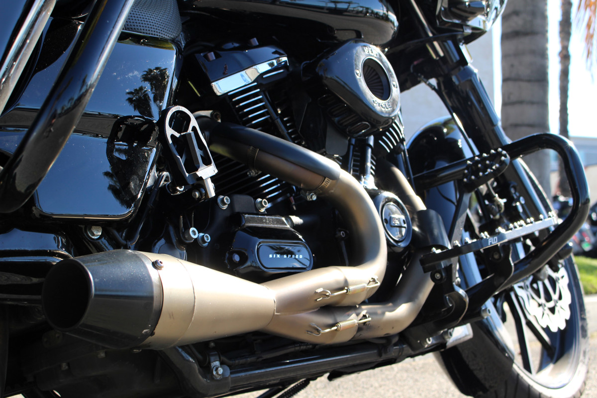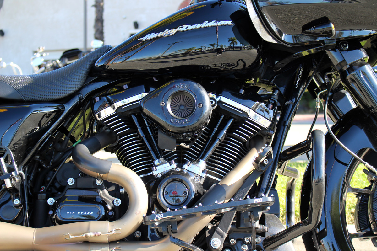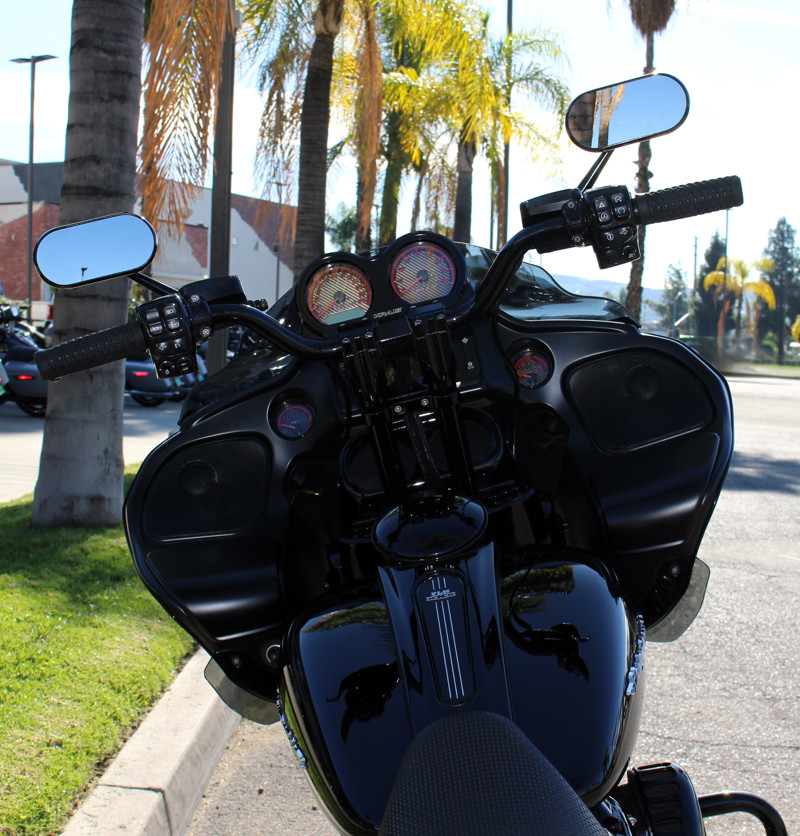 2017 Road Glide FLTRX — custom exhaust, risers & bars with Kraus gauge setup, Flo controls, and custom seat.