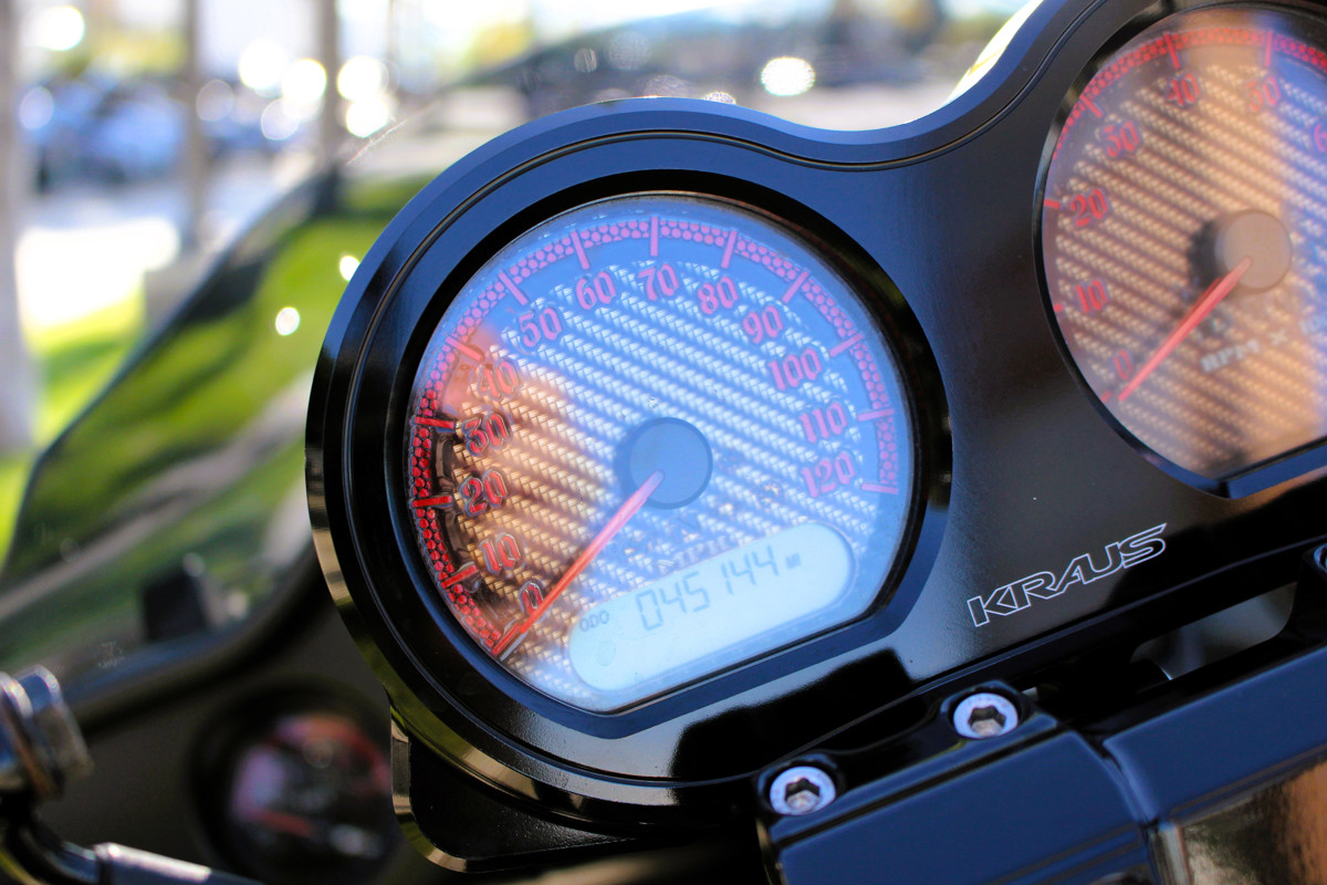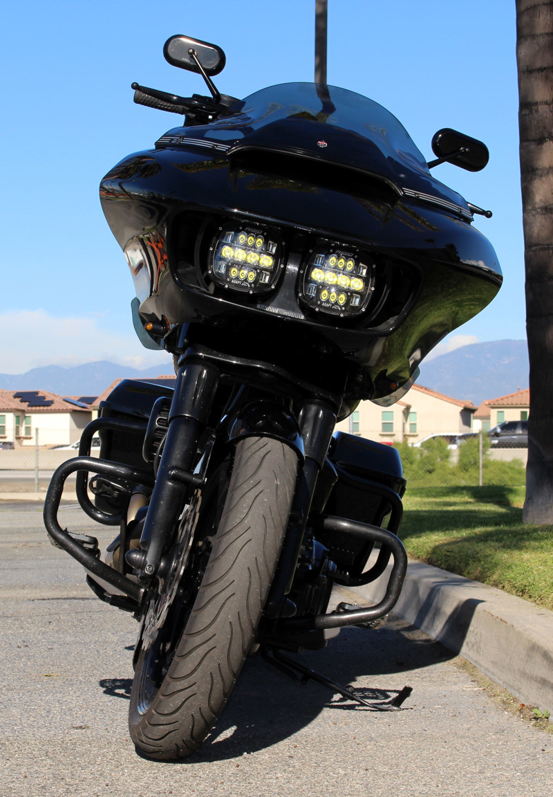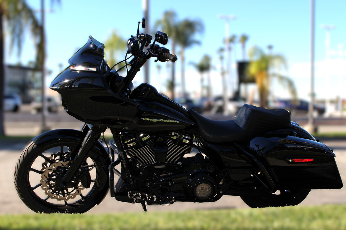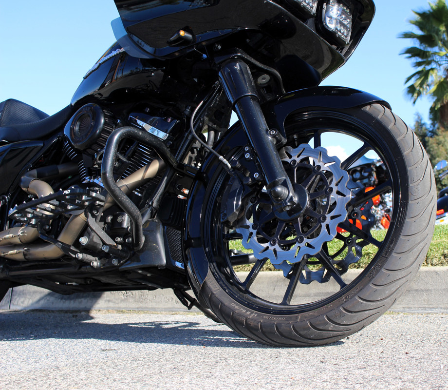 2017 Road Glide FLTRX — custom exhaust, risers & bars with Kraus gauge setup, Flo controls, and custom seat.