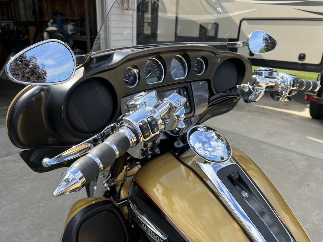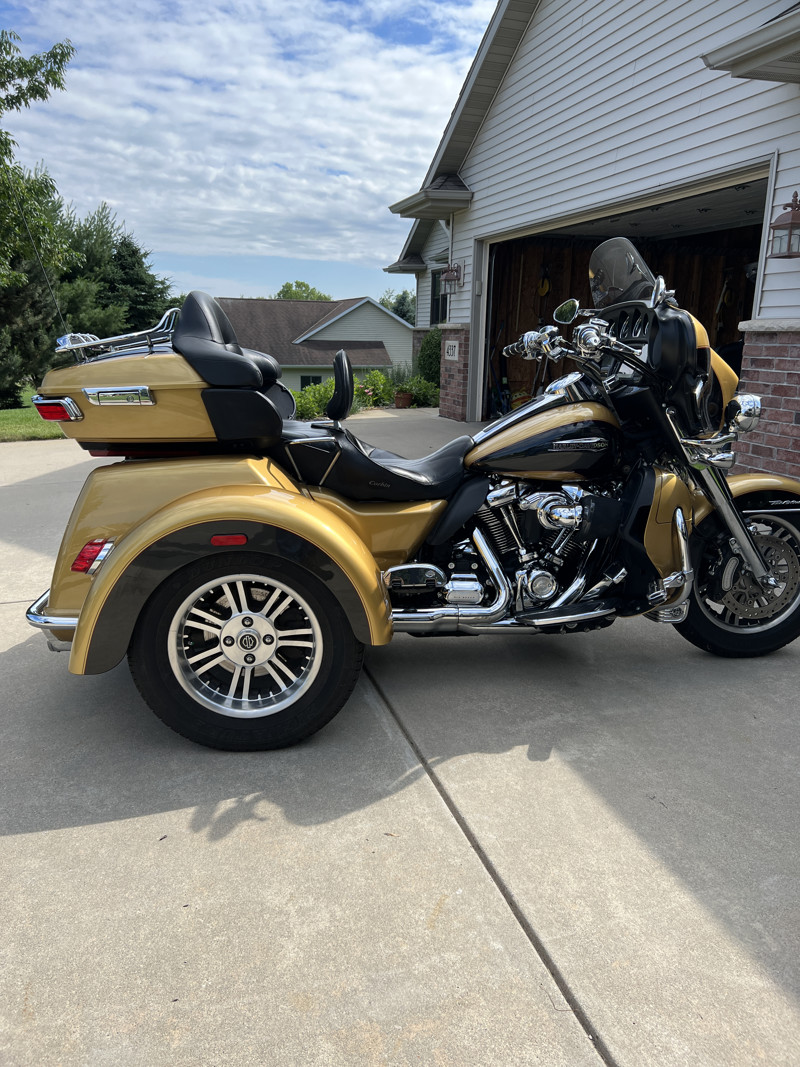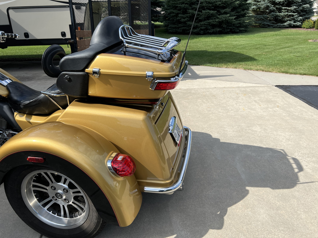 2017 H-D Tri Glide. Excellent condition. Hydraulic clutch, 107 engine, ABS breaks. New in ‘22 Legends Revo-A shocks. Vance & Hines exhaust, Chrome front forks, primary cover, brake fluid reservoir, after market footboards, passenger footboards, adjustable passenger footboards, Heli-Bar handle bars, grips, rear bumper, LED brake lights and tour pack trim, luggage rack, new front tire, Corbin seat and backrest, and more.