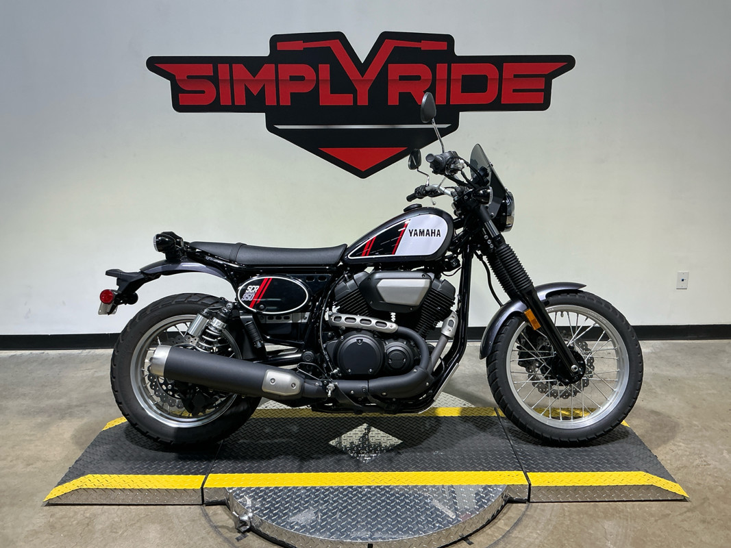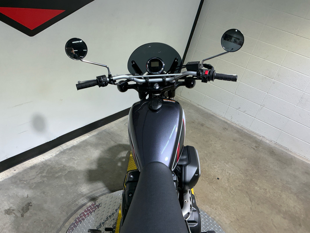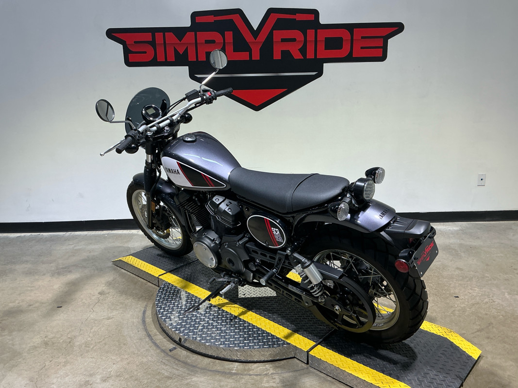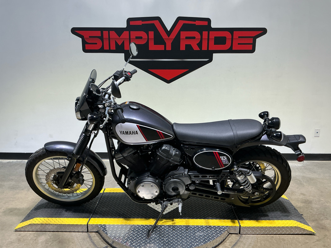 The SCR950 combines vintage, scrambler styling with modern engineering. Potent 942 cc V-twin, spoke wheels, high rear fender.