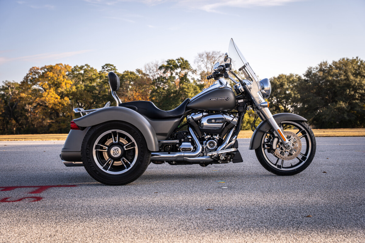 The Freewheeler model puts stripped-down custom style into an easy handling frame that lets you roll with the confidence three wheels gives to a rider. You get classic cruiser lines and styling details, like bobtail rear fenders, slash cut pipes, a chrome headlight nacelle, 12-inch mini-ape hangers and Enforcer aluminum wheels. You also get enough cargo space to hold two full-face helmets plus your extra gear. The acceleration is instant, thanks to the low-end torque of the Milwaukee-Eight 107 engine. And the 49mm front forks and adjustable rear suspension make the ride smooth. They say good things come in threes, and Freewheeler is the proof.