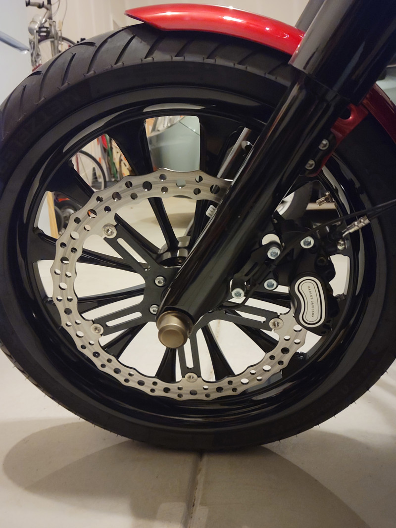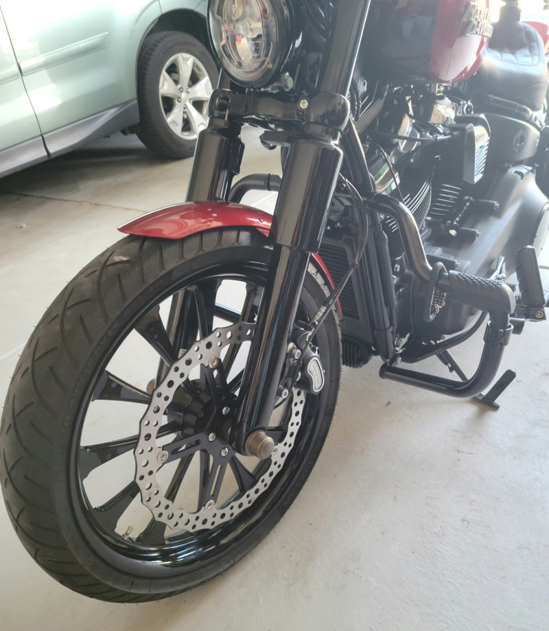 Front 21”x3.5” w/ Metzler ME888 120/70/21 powder coated black gloss.