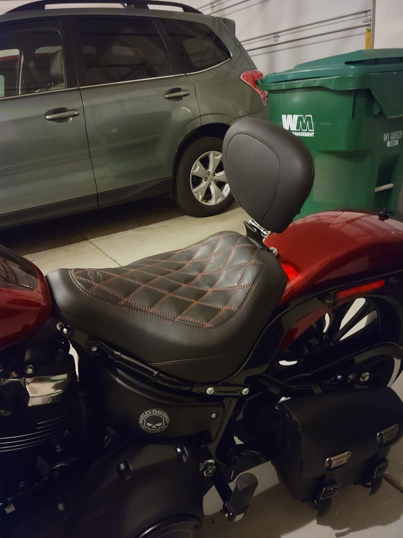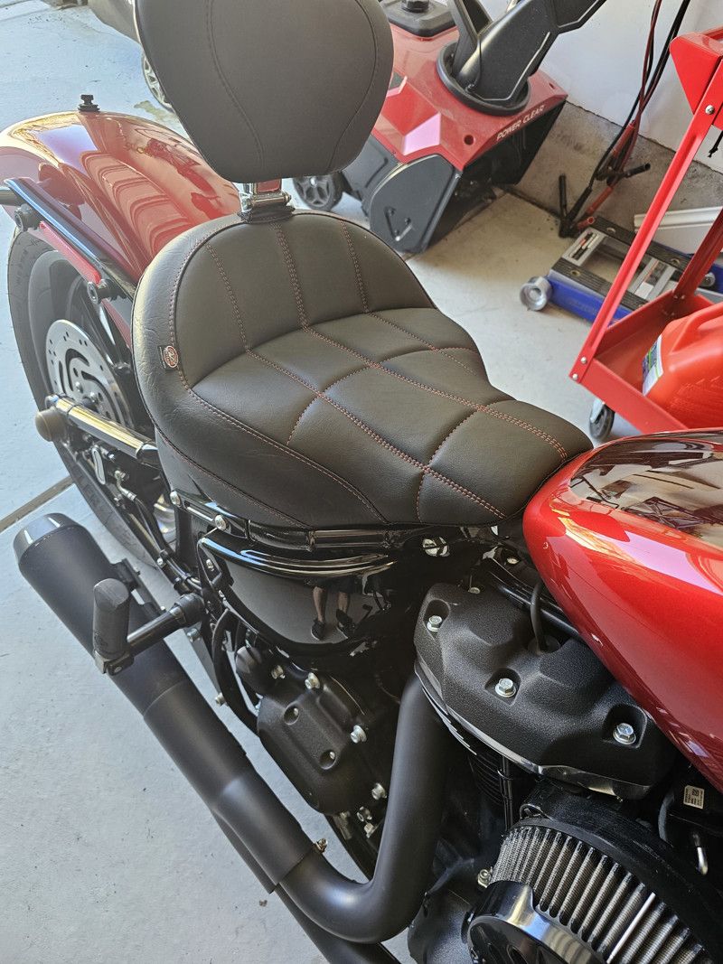 12. Mustang wide tripper diamond red stitched seat with removable backrest. Mustang rear pilon