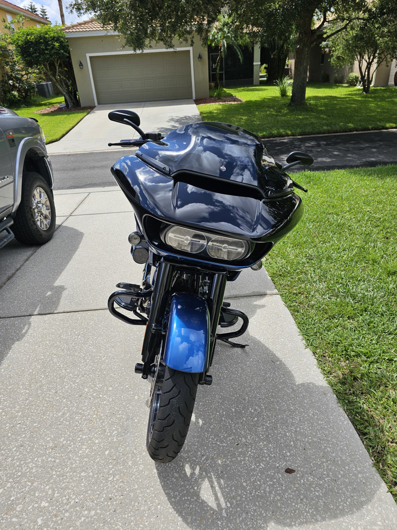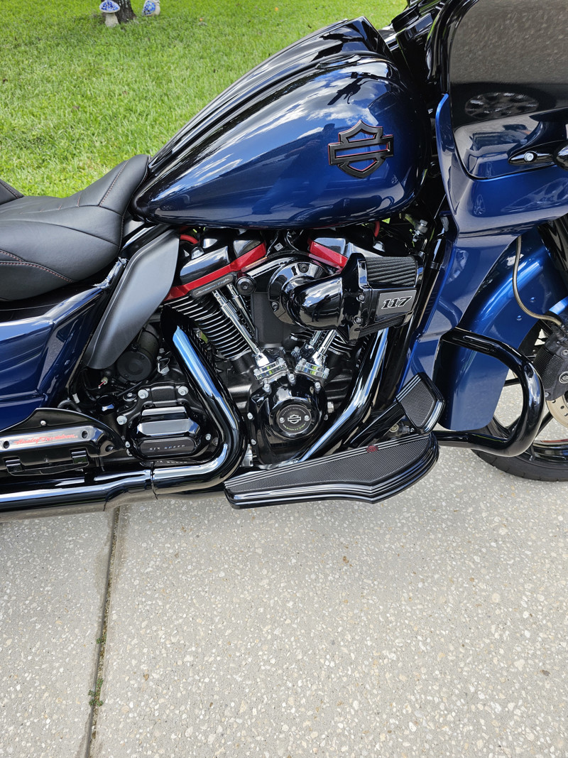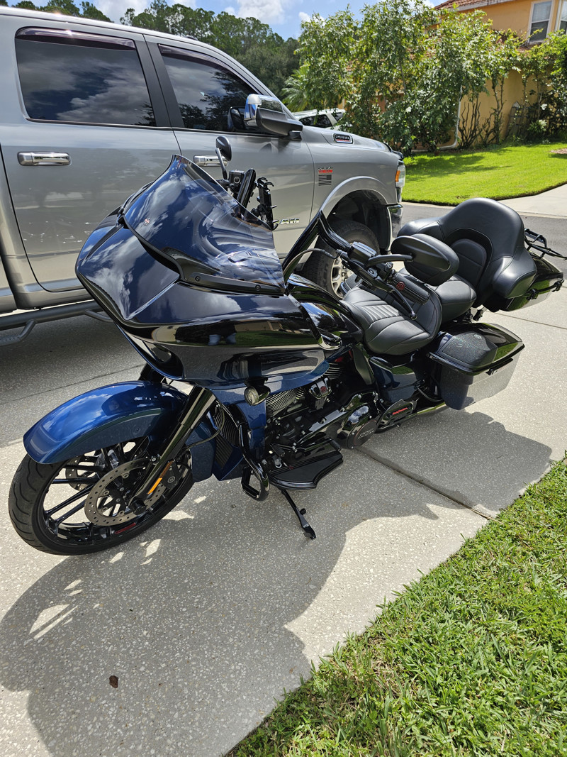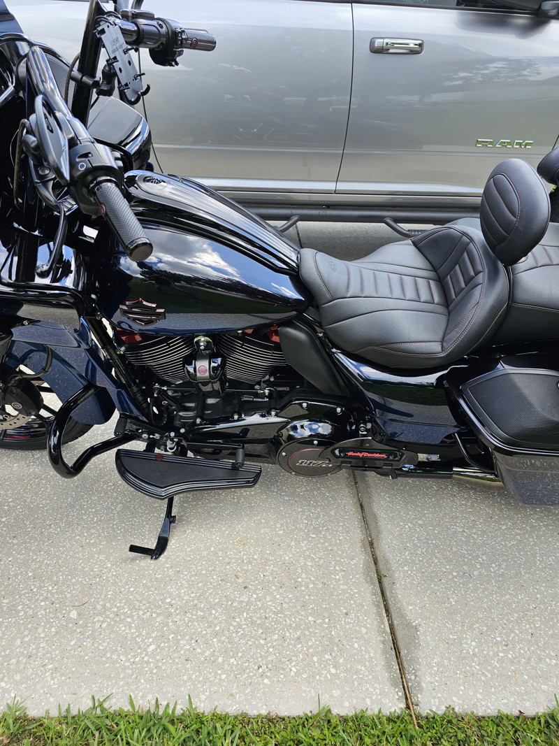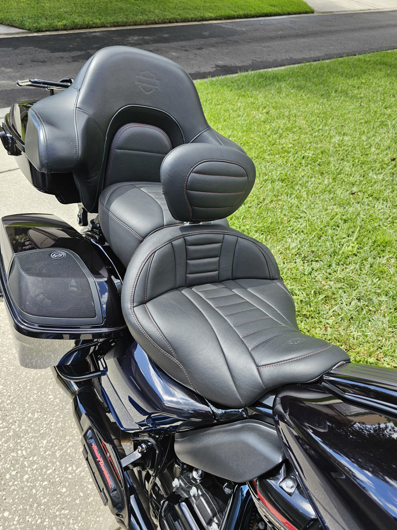 Mustang seat w/ rider backrest, pax pillion w/ cvo full backrest attached to a paint matched by gunslinger razor tour pak with organizer