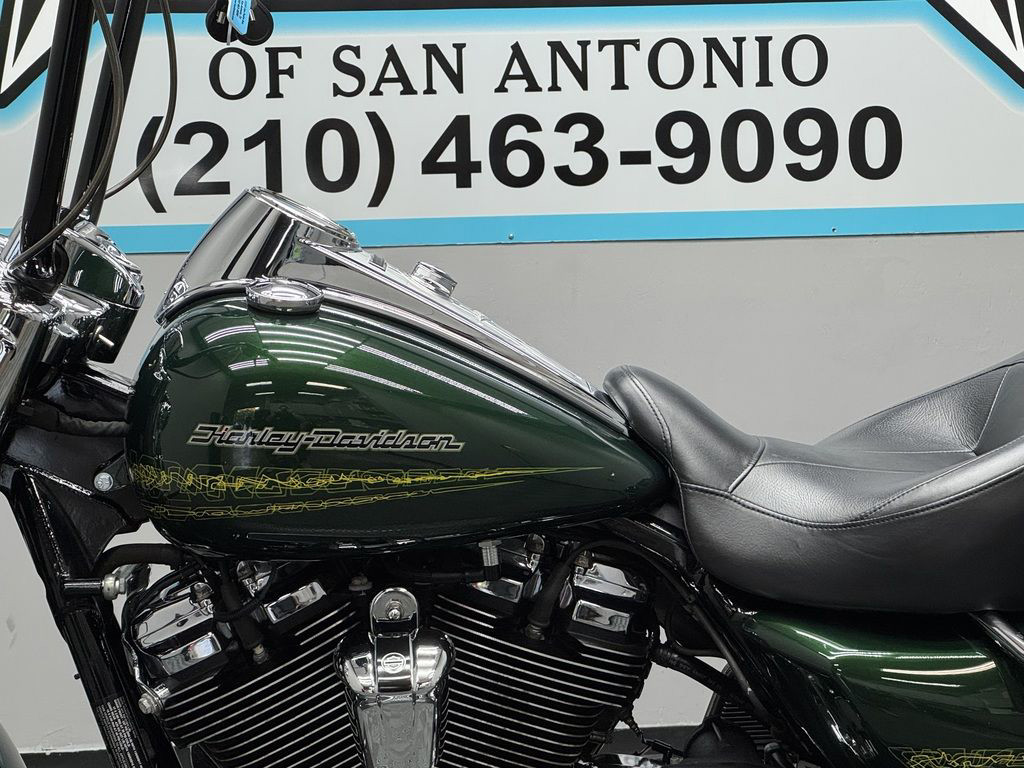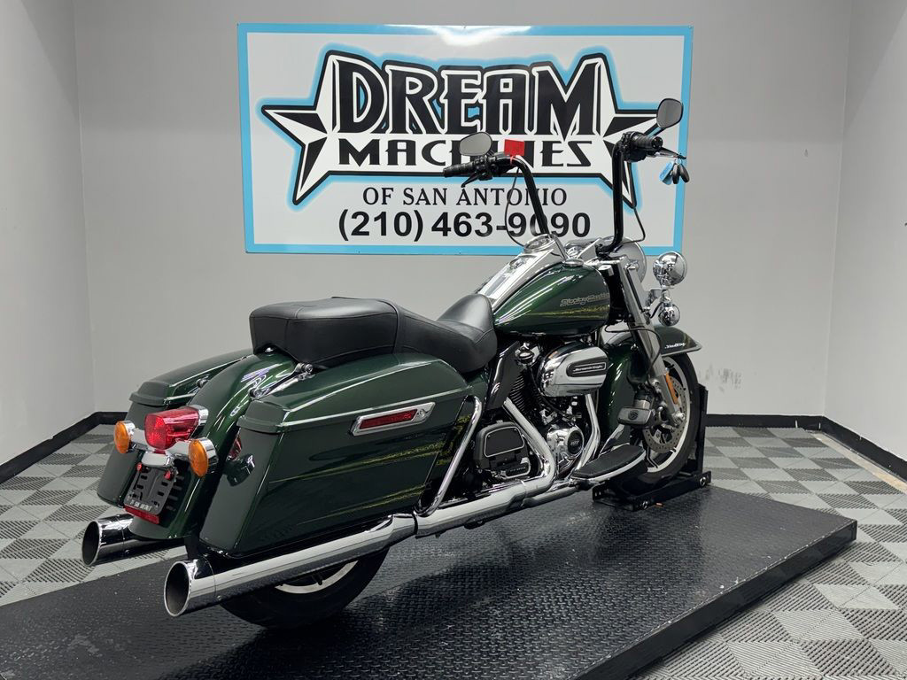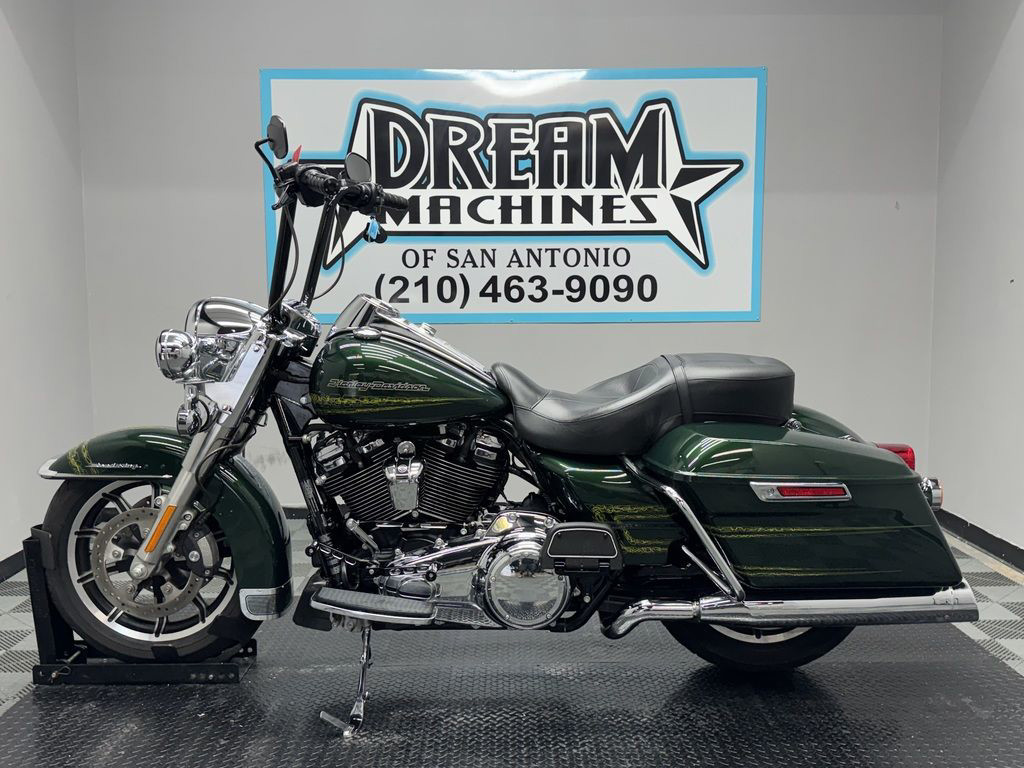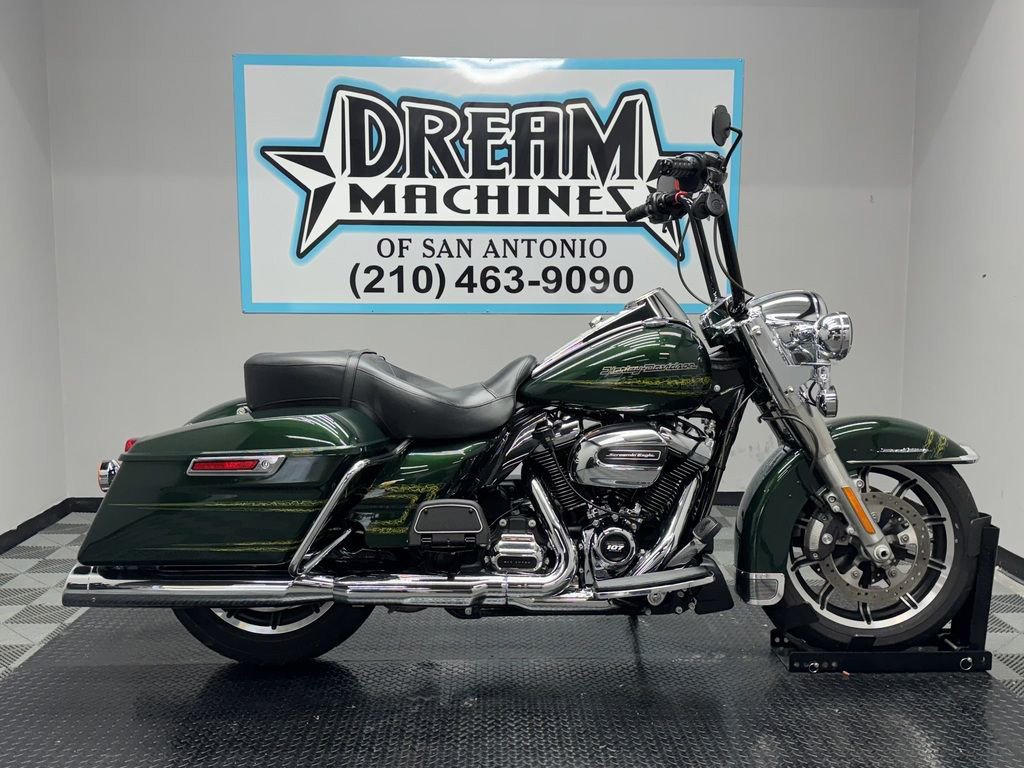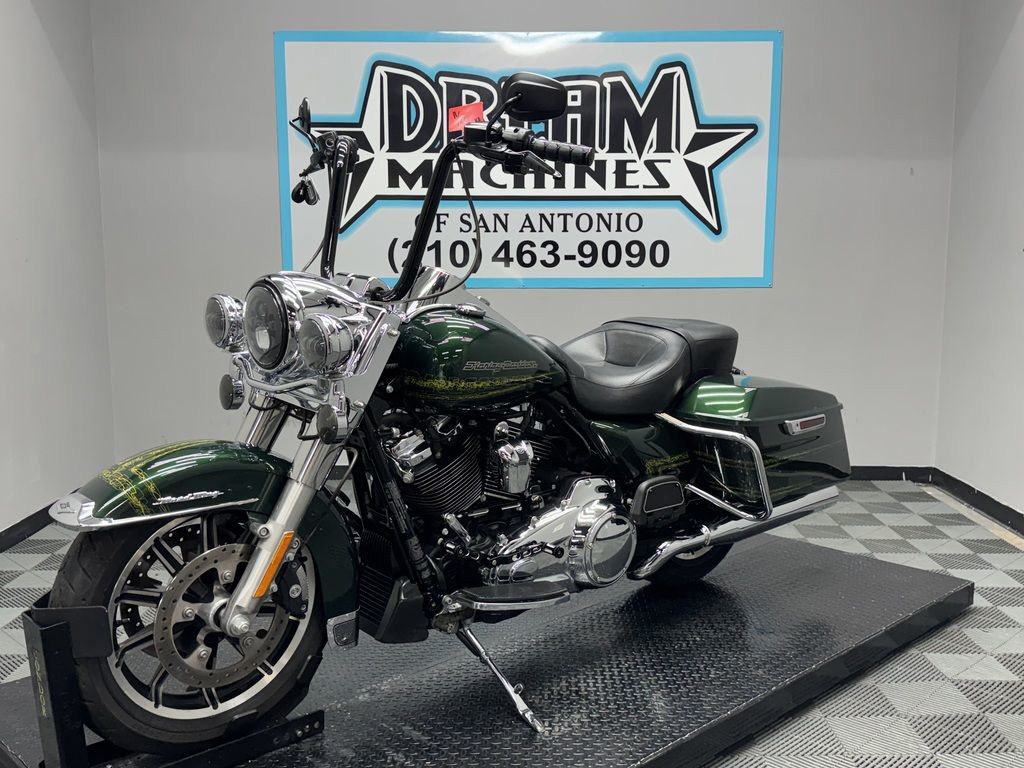 *BOOK VALUE IS $13,353 SHIPPING, LEASING, FINANCING AND EXTENDED WARRANTY MAY BE AVAILABLE! YOU ARE LOOKING AT A 2019 HARLEY DAVIDSON ROAD KING (FLHR) WITH 9,861 MILES ON IT. IT IS KINETIC GREEN IN COLOR AND POWERED BY A 1746CC (107") FUEL INJECTED MILWAUKEE EIGHT ENGINE AND 6 SPEED TRANSMISSION. THE BIKE COMES WITH CRUISE CONTROL, 2 KEYS, 2 FOBS AND FACTORY SECURITY SYSTEM. THERE ARE SOME EXTRAS ON THE BIKE WHICH INCLUDE SCREAMIN' EAGLE SLIP-ON MUFFLERS ($674.95), STAGE 1 AIR INTAKE ($139.95), HAMMOCK SEAT ($649.95), LED HEADLIGHT ($399.95), LED PASSING LAMPS ($199.95), APE HANGER BARS ($294.95), GRIPS ($79.95), LEVERS ($99.95) AND COMBINATION ANALOG SPEEDOMETER/TACHOMETER ($399.95). THERE ARE NO SCRATCHES, DENTS, OR DINGS THAT I CAN FIND WITH THE EXCEPTION OF SMALL SCRATCHES ON THE TANK AND REAR FENDER. THE CHROME AND ALUMINUM ARE IN GOOD CONDITION. THE TIRES HAVE GOOD TREAD LEFT ON THEM.
