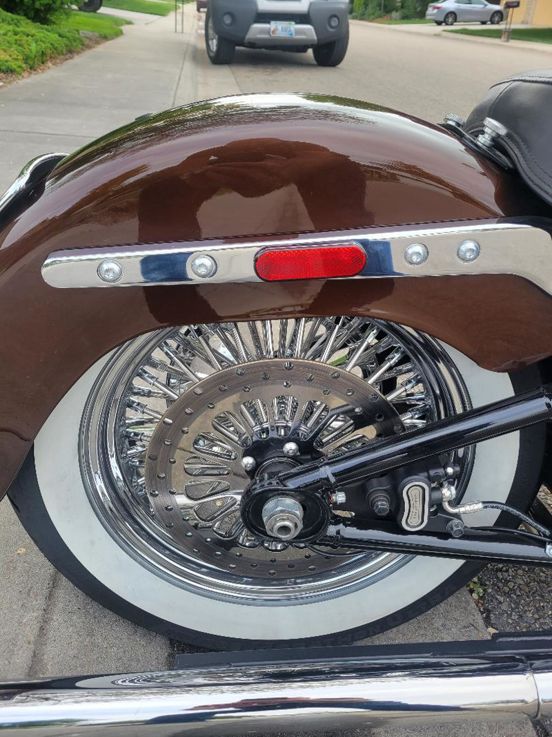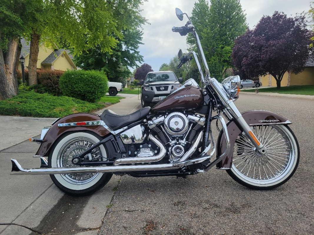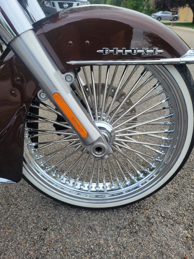 M8 107" motor with screaming eagle stage one igntion and intake w/ K&N air filter. Six (6) speed transmission. 500 miles + or - on build. All work was done by High Desert Harley Davidson per my custom design. 16" ape hanger bars, DNA Mammoth spoke wheels, 21" front with Metzeler low profile white wall. 16" Metzeler rear white wall. DNA matching rotors front and rear, ABS braking. Bassani Dual exhaust with fishtails. Legends air ride suspension. Black stainless braid / coated clutch cable and hydraulic front brake line. This bike gets a lot of attention from it's looks, it is a head turner. Sheet metal and paint are perfect and is garage kept. I do have every OEM part that was taken off so you can put it bake to stock. "Harley stopped production of the Deluxe in 2020."