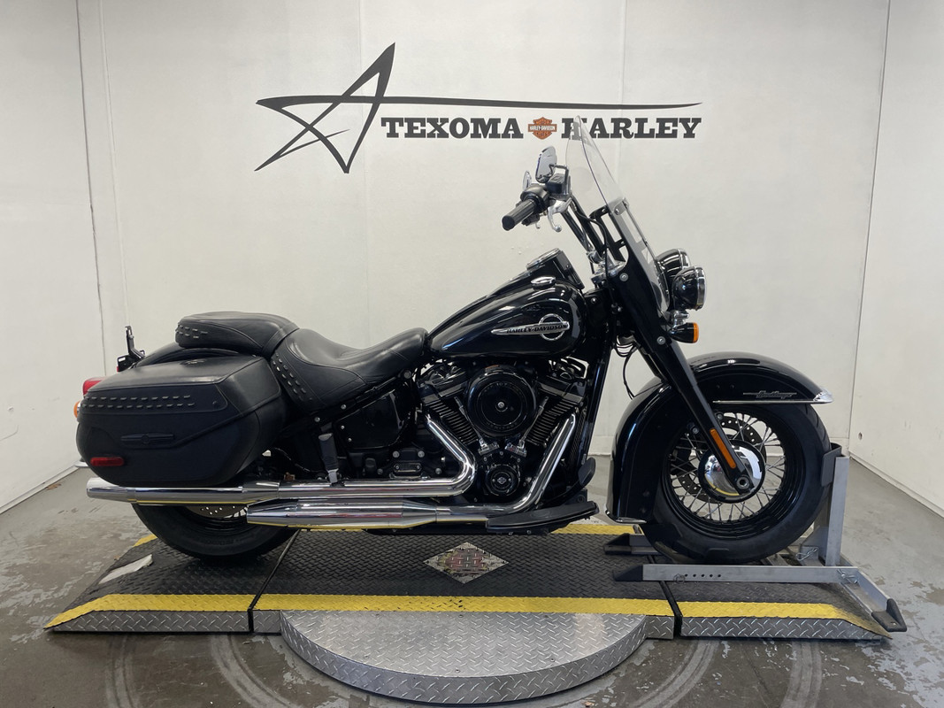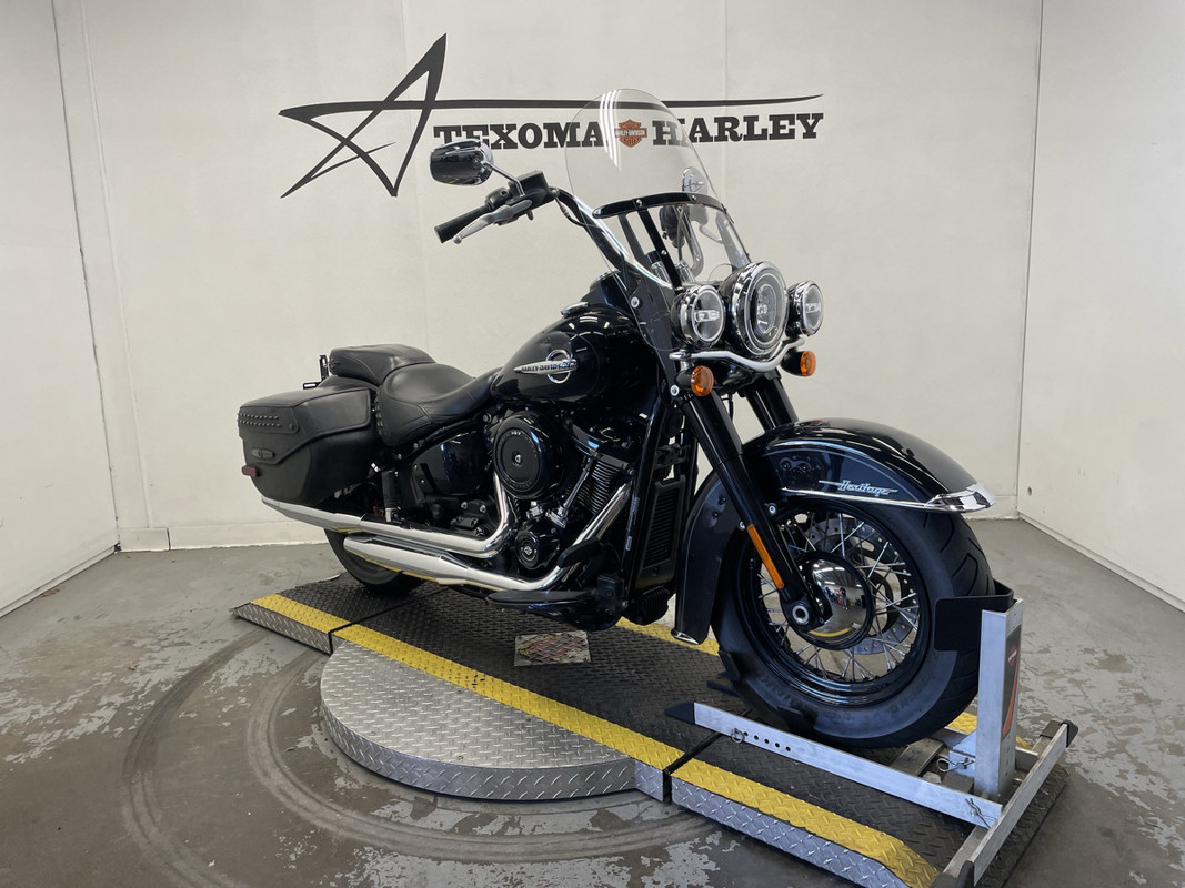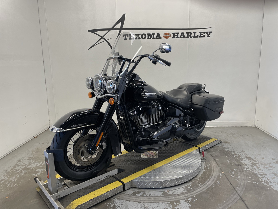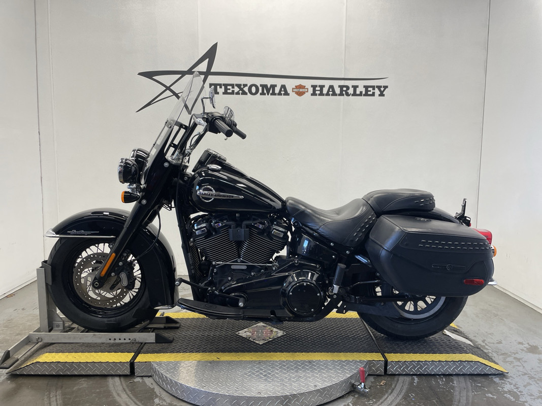 The Heritage Classic is part of Harley-Davidson's renowned Softail family, boasting a standout silhouette that's both timeless and instantly recognizable. This particular model sports a sleek black exterior with pinstripe accents, exuding a sense of style that's both classic and modern.