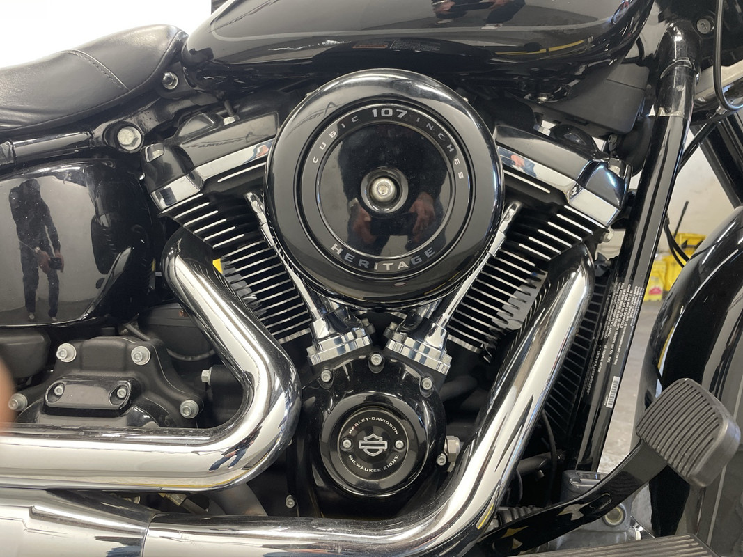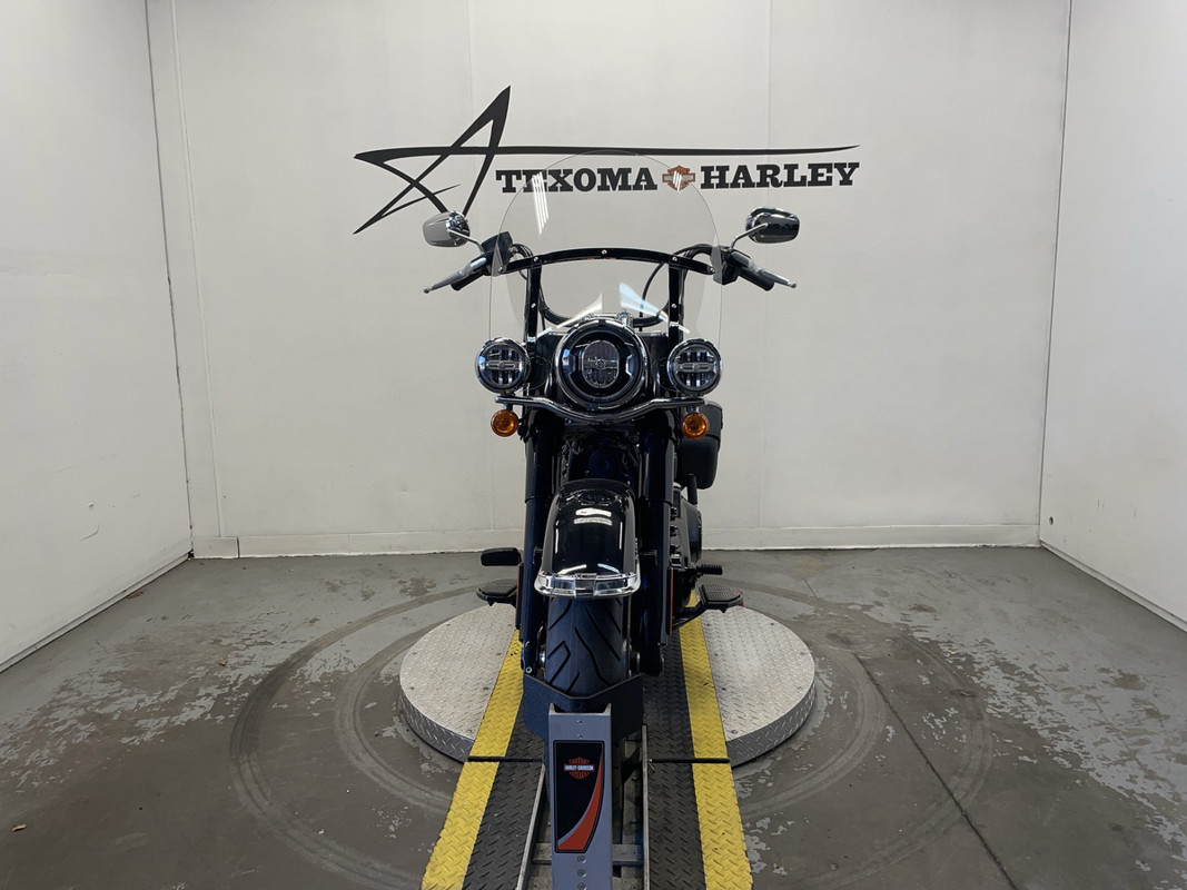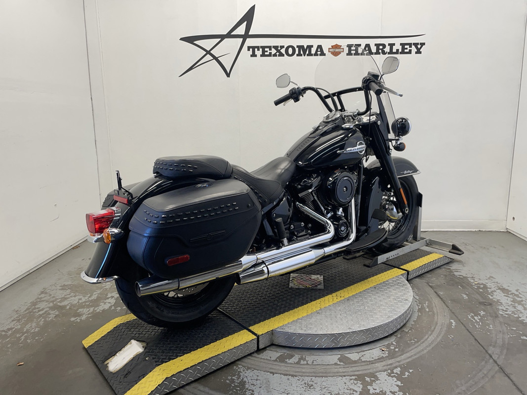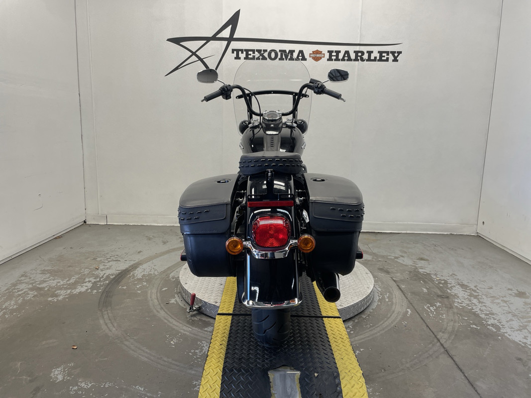 The Heritage Classic is part of Harley-Davidson's renowned Softail family, boasting a standout silhouette that's both timeless and instantly recognizable. This particular model sports a sleek black exterior with pinstripe accents, exuding a sense of style that's both classic and modern.