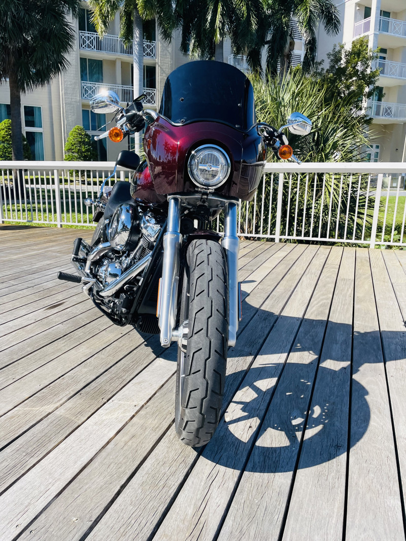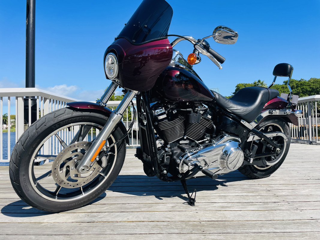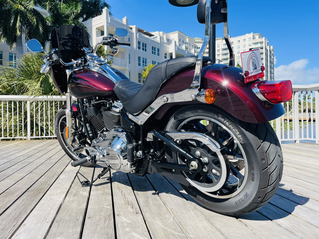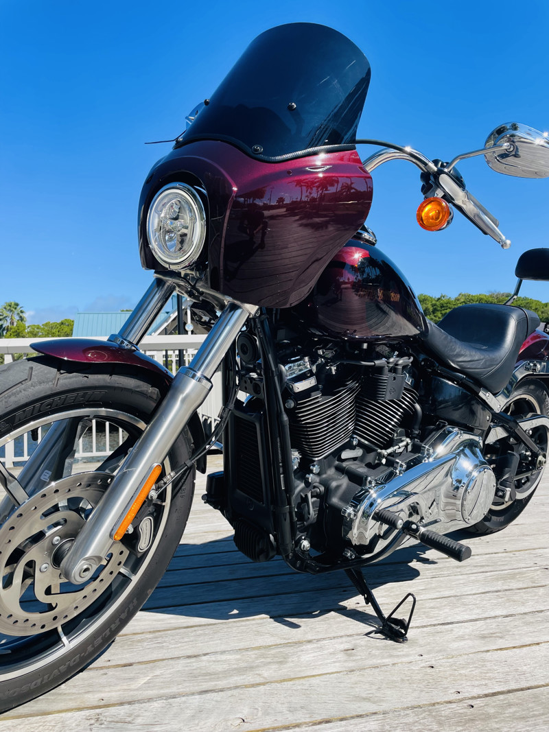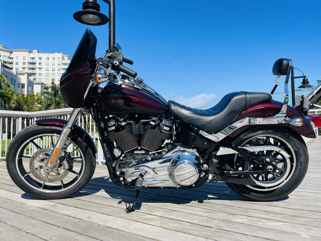 The new and improved Low Rider Softail with the new Milwaukee Eight motor is an amazing bike. Smooth ride with fast and responsive engine an of course 6-speed for those longer rides. This 2019 has been owned by an elderly rider who bought this bike new and rarely rode it. It had an unfortunate incident when it rubbed during transport on the left side of the tank and rubbed through the clear. See the walk around video for details. The bike was sold by us a year ago to another rider who added 2K miles and had installed the fairing, buffed the clear coat out and kept the bike in loving condition. The bike shows exceptional well. Twisted Cherry paint and all the chrome is nearly flawless (with the small exception on the left side tank). Why buy new?