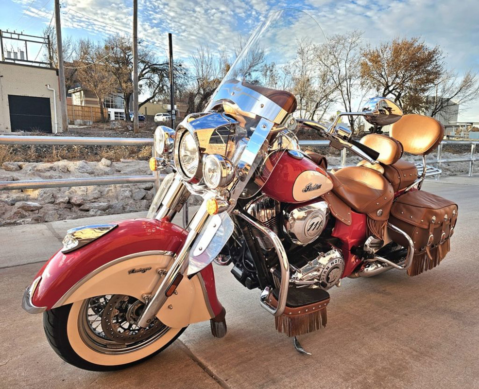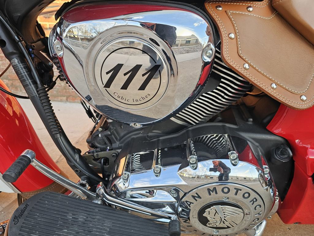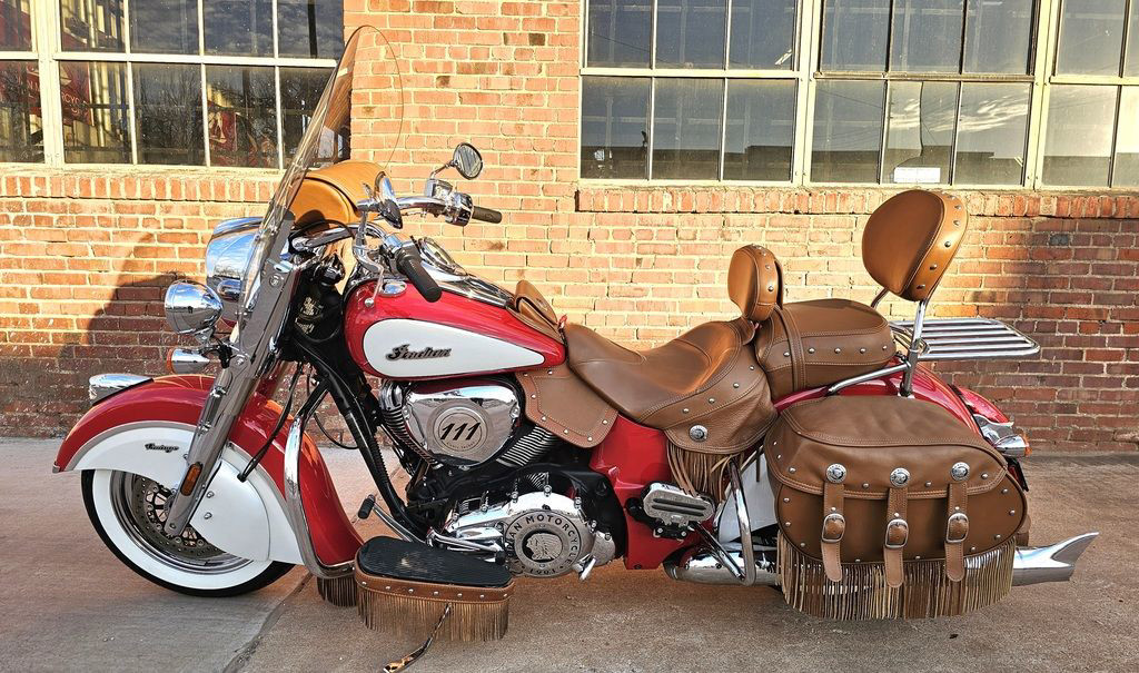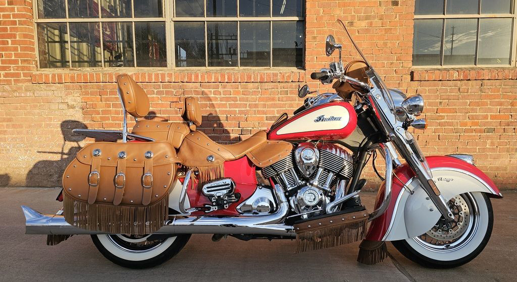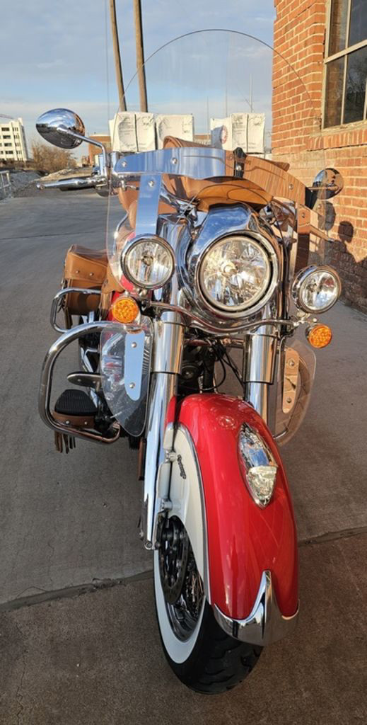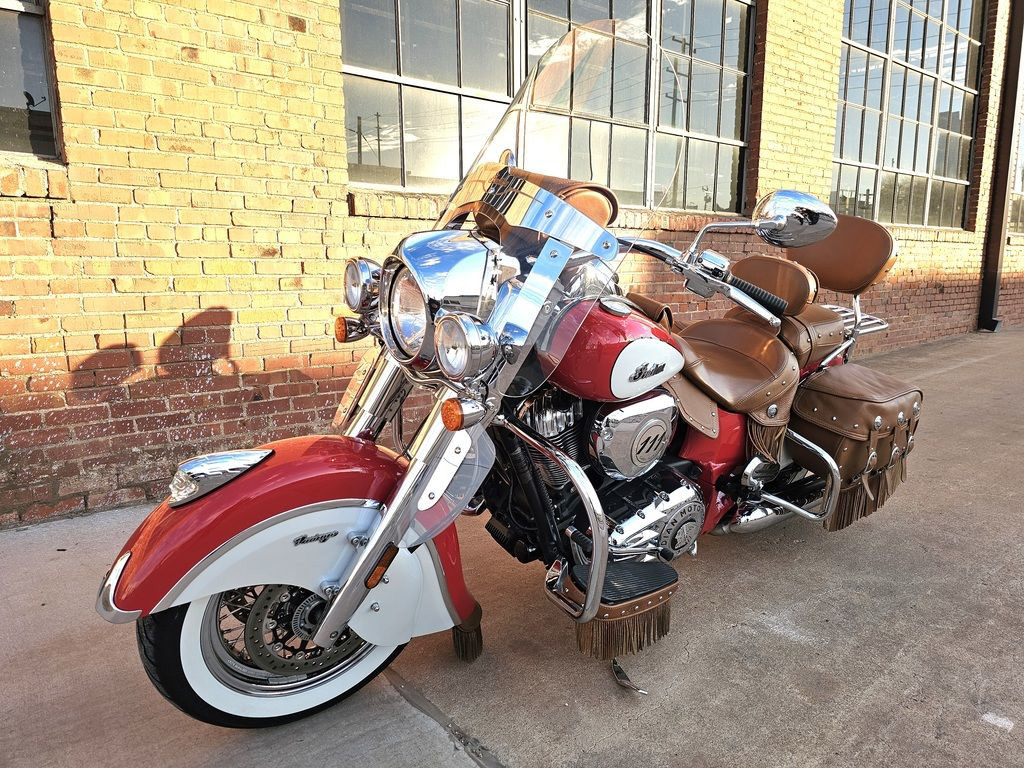 2019 Indian Chief Vintage Icon series. Patriot Red / Pearl White with 16,026 miles. 111 cubic inch Thunderstroke V Twin motor with 6 speed transmission. Bike has Indian stage one exhaust with fishtails, quick release rider and passenger backrest with luggage rack, Fox air shock, lower wind deflectors, rear highway bars and Heritage leather floorboard and fender trim ENGINE & DRIVETRAINBore x Stroke3.976 in x 4.449 in (101 mm x 113 mm)Compression Ratio9.5:1Displacement111 cu in (1,811 cc)Drive/Driven ClutchWet, Multi-PlateElectronic Fuel Injection SystemClosed loop fuel injection / 54 mm boreEngine TypeThunderstroke 111ExhaustSplit Dual Exhaust w/ Cross-overGear Ratio (1st)9.403 : 1Gear Ratio (2nd)6.411 : 1Gear Ratio (3rd)4.763 : 1Gear Ratio (4th)3.796 : 1Gear Ratio (5th)3.243 : 1Gear Ratio (6th)2.789 : 1HorsepowerN/APeak Torque119 ft-lb (161.6 Nm)Peak Torque RPM3,000 rpmTransmission/Final Drive2.2 : 1Transmission/Primary DriveGear Drive Wet ClutchDIMENSIONSFuel Capacity5.5 gal (20.8 L)Ground Clearance5.5 in (140 mm)GVWR1,260 lb (572 kg)Lean Angle31°Overall Height58.7 in (1,491 mm)Overall Length103.5 in (2,630 mm)Overall Width39.4 in (1,000 mm)Rake/Trail29° / 6.1 in (155.0 mm)Seat Height26.0 in (660 mm)Weight (Empty Tank / Full of Fuel)805 lbs / 837 lbs (365 kg / 379 kg)Wheelbase68.1 in (1,730 mm)BRAKESFront BrakesDual / 300 mm Floating Rotor / 4 Piston CaliperRear BrakesSingle / 300 mm floating rotor / 2 piston caliperTIRES / WHEELSFront TiresDunlop® American Elite 130/90B16 67HFront WheelSpoked 16 in x 3.5 inRear TiresDunlop® American Elite 180/65B16 81HRear WheelSpoked 16 in x 5 inSUSPENSIONFront Fork Tube Diameter46 mmFront SuspensionTelescopic Fork - Cartridge TypeFront Travel4.7 in (119 mm)Rear SuspensionSingle ShockRear Travel3.7 in (94 mm)FEATURESColor / GraphicsThunder BlackFactory Warranty2 Years, Unlimited MilesGaugesTank-mounted electronic speedometer with odometer; dual tripmeters; digital tachometer; ambient air temperature; fuel range; average fuel economy; battery voltage; gear position display; real-time clock; vehicle trouble code readout; heated grip level (if heated grips installed); low engine oil pressure; and 9 LED telltale indicators: cruise control enabled, cruise control set, neutral, high beam, turn signal, ABS, check engine, and MPH or km/h unit designation; tank-mounted electronic fuel gauge with low fuel LED indicatorInfotainmentN/ALightsN/AStandard EquipmentQuick Release Lexan Windshield; Genuine Leather Seats; Genuine Leather Saddlebags; Highway Bars; Light Bar; ABS; Cruise Control; Keyless Ignition; Indian® Script Tank Badge; Indian® Headdress Fender Ornament
