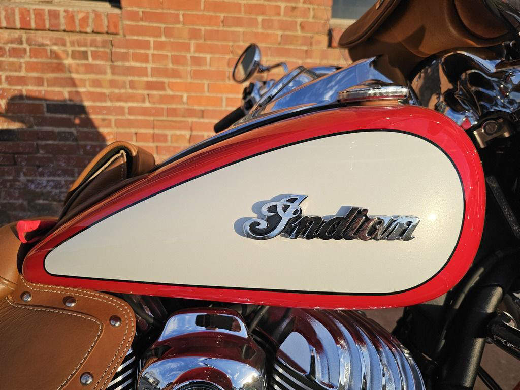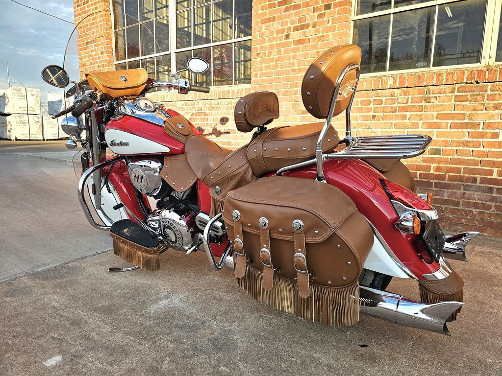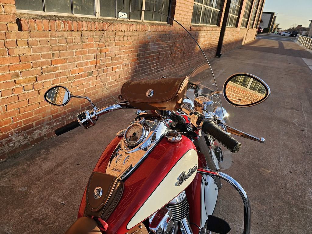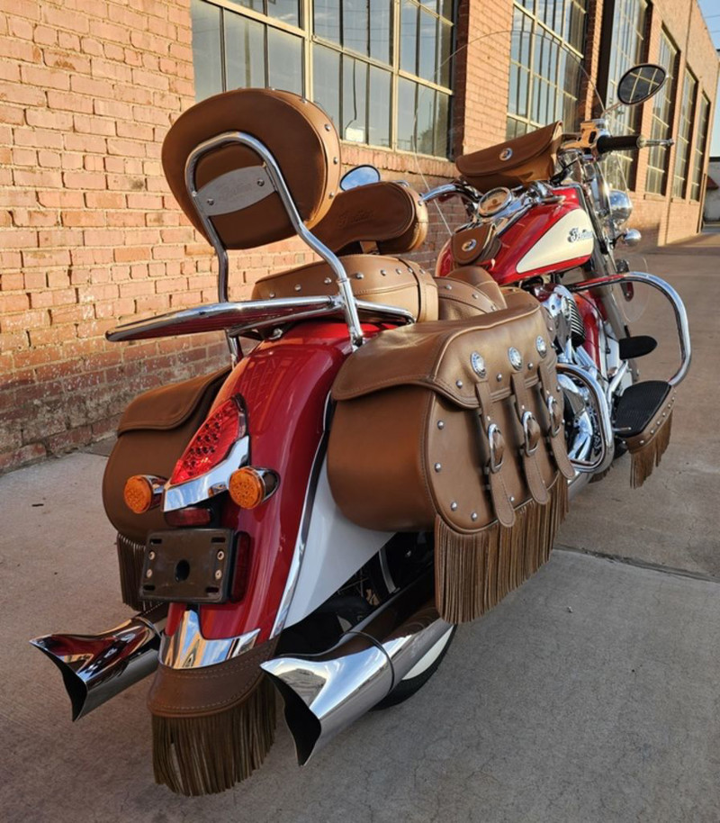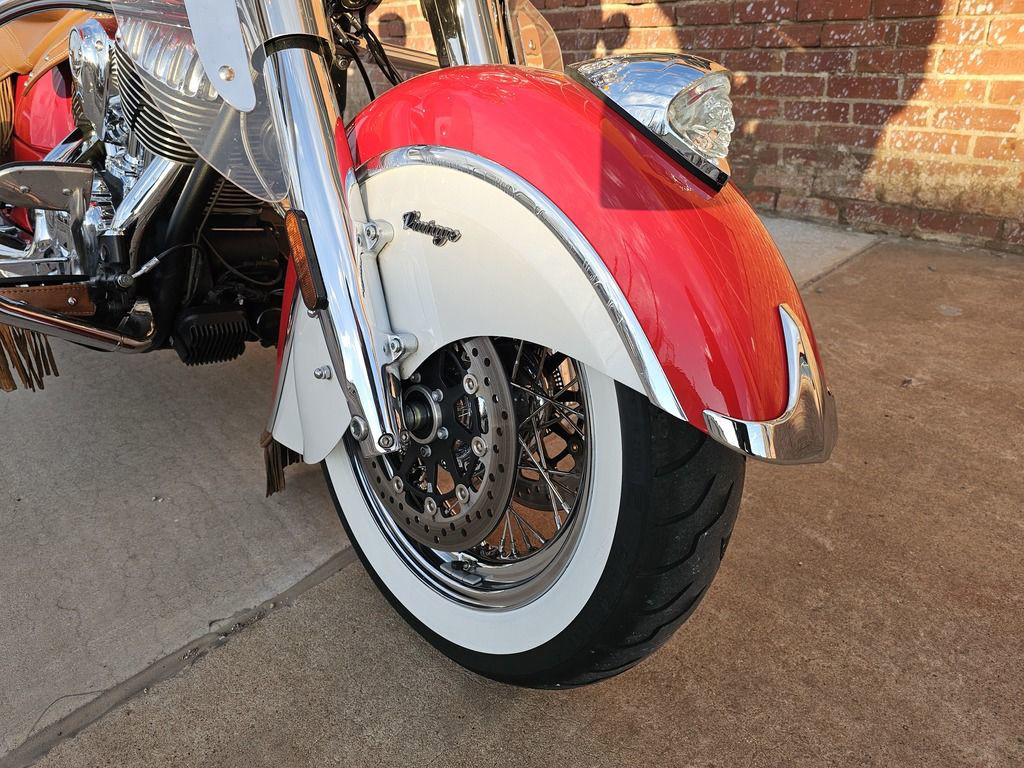 2019 Indian Chief Vintage Icon series. Patriot Red / Pearl White with 16,026 miles. 111 cubic inch Thunderstroke V Twin motor with 6 speed transmission. Bike has Indian stage one exhaust with fishtails, quick release rider and passenger backrest with luggage rack, Fox air shock, lower wind deflectors, rear highway bars and Heritage leather floorboard and fender trim ENGINE & DRIVETRAINBore x Stroke3.976 in x 4.449 in (101 mm x 113 mm)Compression Ratio9.5:1Displacement111 cu in (1,811 cc)Drive/Driven ClutchWet, Multi-PlateElectronic Fuel Injection SystemClosed loop fuel injection / 54 mm boreEngine TypeThunderstroke 111ExhaustSplit Dual Exhaust w/ Cross-overGear Ratio (1st)9.403 : 1Gear Ratio (2nd)6.411 : 1Gear Ratio (3rd)4.763 : 1Gear Ratio (4th)3.796 : 1Gear Ratio (5th)3.243 : 1Gear Ratio (6th)2.789 : 1HorsepowerN/APeak Torque119 ft-lb (161.6 Nm)Peak Torque RPM3,000 rpmTransmission/Final Drive2.2 : 1Transmission/Primary DriveGear Drive Wet ClutchDIMENSIONSFuel Capacity5.5 gal (20.8 L)Ground Clearance5.5 in (140 mm)GVWR1,260 lb (572 kg)Lean Angle31°Overall Height58.7 in (1,491 mm)Overall Length103.5 in (2,630 mm)Overall Width39.4 in (1,000 mm)Rake/Trail29° / 6.1 in (155.0 mm)Seat Height26.0 in (660 mm)Weight (Empty Tank / Full of Fuel)805 lbs / 837 lbs (365 kg / 379 kg)Wheelbase68.1 in (1,730 mm)BRAKESFront BrakesDual / 300 mm Floating Rotor / 4 Piston CaliperRear BrakesSingle / 300 mm floating rotor / 2 piston caliperTIRES / WHEELSFront TiresDunlop® American Elite 130/90B16 67HFront WheelSpoked 16 in x 3.5 inRear TiresDunlop® American Elite 180/65B16 81HRear WheelSpoked 16 in x 5 inSUSPENSIONFront Fork Tube Diameter46 mmFront SuspensionTelescopic Fork - Cartridge TypeFront Travel4.7 in (119 mm)Rear SuspensionSingle ShockRear Travel3.7 in (94 mm)FEATURESColor / GraphicsThunder BlackFactory Warranty2 Years, Unlimited MilesGaugesTank-mounted electronic speedometer with odometer; dual tripmeters; digital tachometer; ambient air temperature; fuel range; average fuel economy; battery voltage; gear position display; real-time clock; vehicle trouble code readout; heated grip level (if heated grips installed); low engine oil pressure; and 9 LED telltale indicators: cruise control enabled, cruise control set, neutral, high beam, turn signal, ABS, check engine, and MPH or km/h unit designation; tank-mounted electronic fuel gauge with low fuel LED indicatorInfotainmentN/ALightsN/AStandard EquipmentQuick Release Lexan Windshield; Genuine Leather Seats; Genuine Leather Saddlebags; Highway Bars; Light Bar; ABS; Cruise Control; Keyless Ignition; Indian® Script Tank Badge; Indian® Headdress Fender Ornament