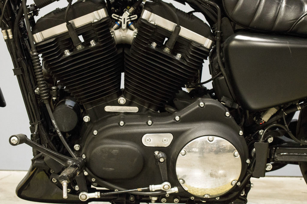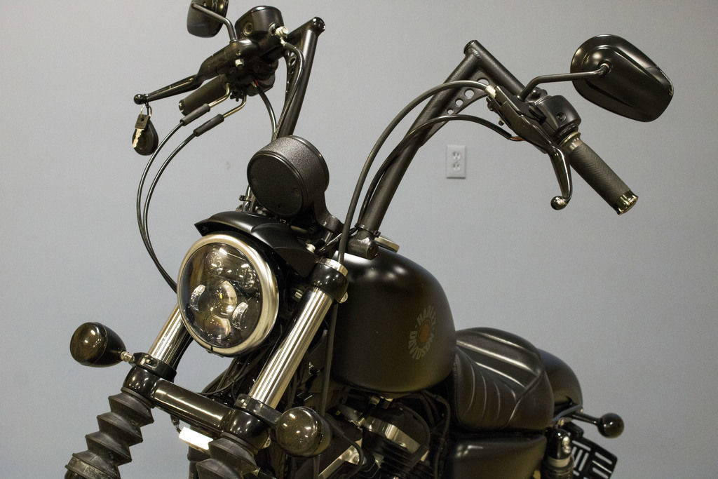 It’s the poster bike of the anti-chrome movement. You’ve got a black powder-coated 883cc engine with black rocker covers. Black on the throwback round air cleaner cover. Chopped fenders, to show off a little rubber and black front forks with gaiters to add a little old-school nostalgia.