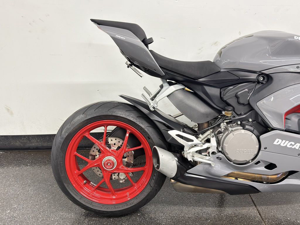 The Panigale V2 features the single-sided aluminum swingarm, the hallmark of every high-end sports Ducati. The extensive fairing highlights the more compact twin-cylinder Superquadro engine (smaller in comparison to the Desmosedici Stradale), creating a bike that is visibly leaner and less intimidating than the Panigale V4.