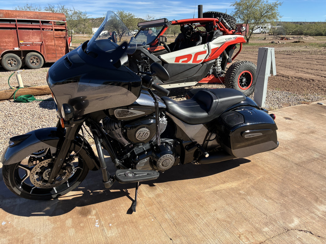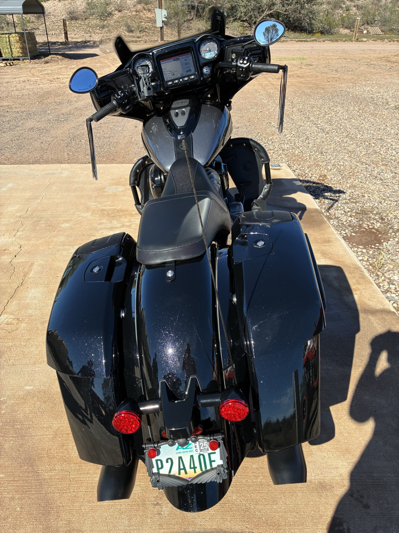 2021 Indian Motorcycle® Chieftain® Elite Thunder Black Vivid Crystal / Carbon Crystal, Tab exhaust reduced reach handlebars, RydeCulture saddlebag lights, lowering kit, also with stock parts.