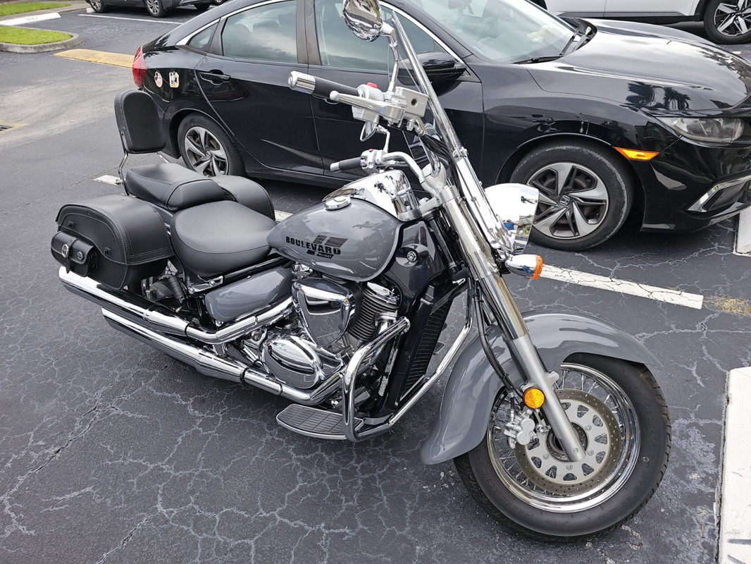 Suzuki 2021 Boulevard C50, 805cc, fuel injected, liquid-cooled, SOHC, four-valve-per-cylinder, 45-degree, V-twin engine, polished aluminum and chrome covers. Tour-ready features include a spacious riding position, aerodynamic height-adjustable windshield with classic styling that includes a unique chrome garnish with Boulevard emblems (Genuine Suzuki Accessory), leather- look saddlebags with studs that match the studded dual seats.