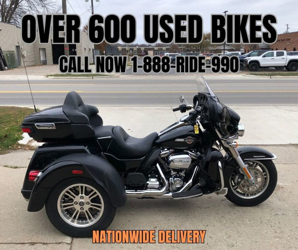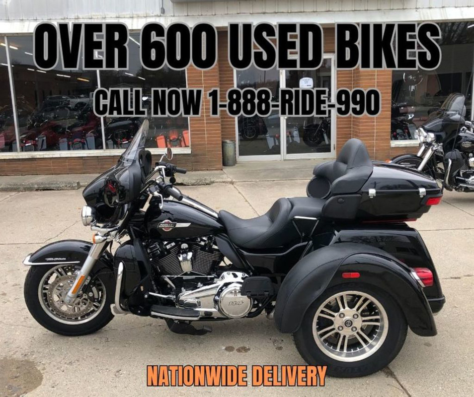 USED HARLEY DAVIDSON TRI GLIDE FOR SALE WITH ONLY 7,633 MILES! CLEAN, CLEAN, CLEAN! NO DENTS, NO DINGS, NO PAINT CHIPS, NO SCRATCHES! THE 114 CUBIC INCH MILWAUKEE 8 MOTOR RUNS STRONG AND THE DUAL SCREAMIN' EAGLE EXHAUST SOUNDS GREAT! THIS ONE HAS IT ALL! FENDER PROTECTORS, OVERSIZED L.E.D. SCREEN, BLUE TOOTH STEREO, NAVIGATION SYSTEM, CRUISE CONTROL, SECURITY SYSTEM, AND MORE! JUST SERVICED AT DEALERSHIP, INSPECTED, ALL FLUIDS CHANGED, RUNS STRONG, EVERYTHING WORKS, NEEDS NOTHING! SOLD NEW FOR OVER $40,000, SAVE OVER $10,000 ON THIS LOW MILEAGE, CLEAN TRIGLIDE WITH OVER $1,500 IN EXTRAS!