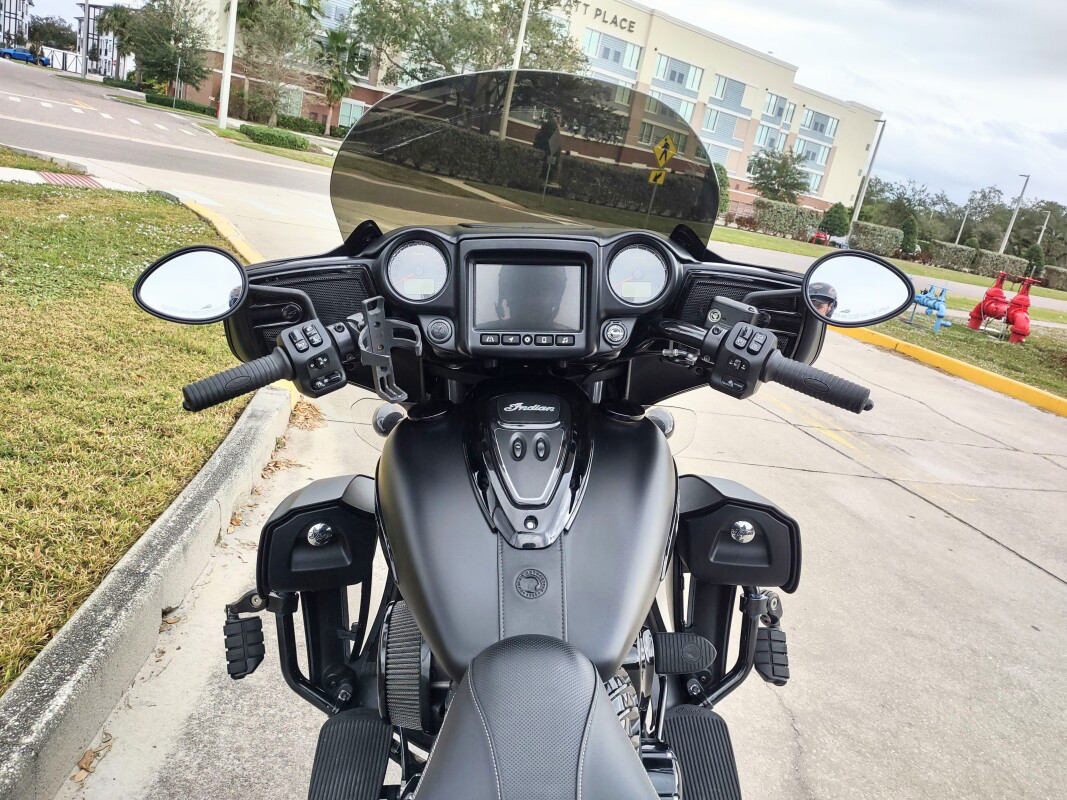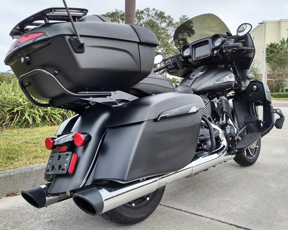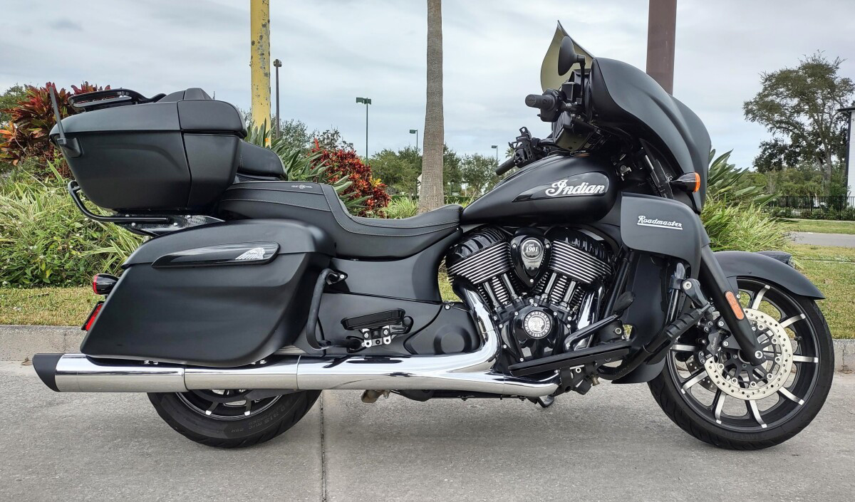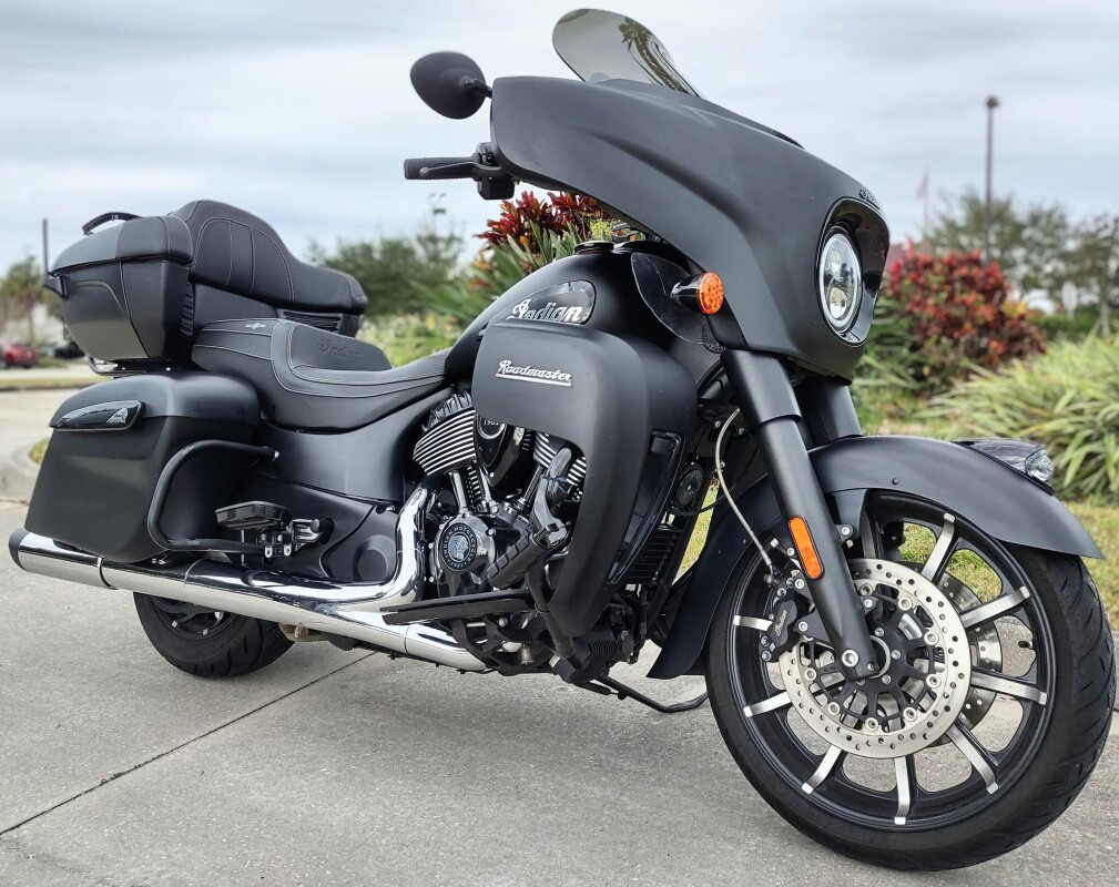 The 2022 Indian Roadmaster Dark Horse is a premium, blacked-out touring motorcycle featuring the powerful Thunderstroke 116 engine (116 cubic inches/1890cc) with 126 ft-lbs of torque, offering a blend of bold style, extensive storage (over 36 gallons), and modern tech like Ride Command with Apple CarPlay for long-haul comfort.