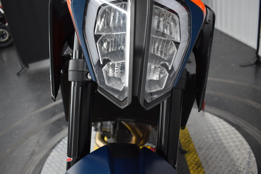 The LED headlights on the KTM 890 DUKE R combine optimal near-field illumination with maximum light output. Daytime running lights ensure that other road users see you coming, which you undoubtedly will be doing at speed.