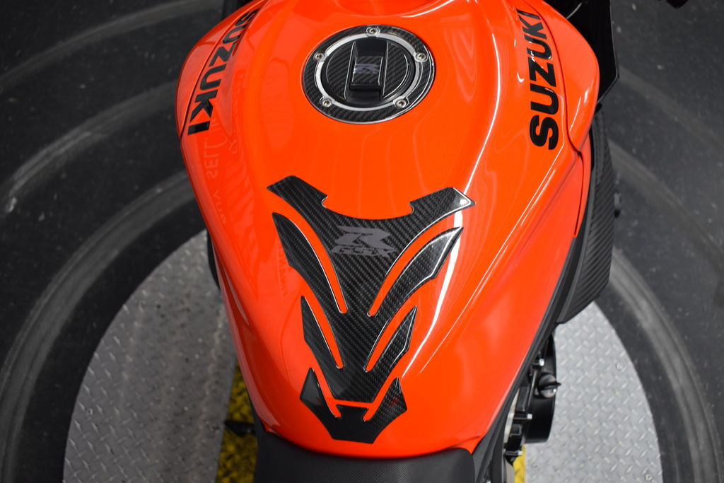Stylized Suzuki “S” 3-D emblems on the fuel tank and the fork upper bracket denotes the quality, sophistication, and performance legacy of the brand.
