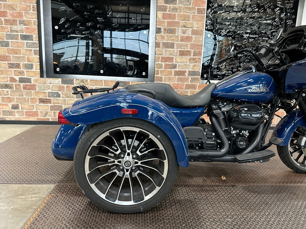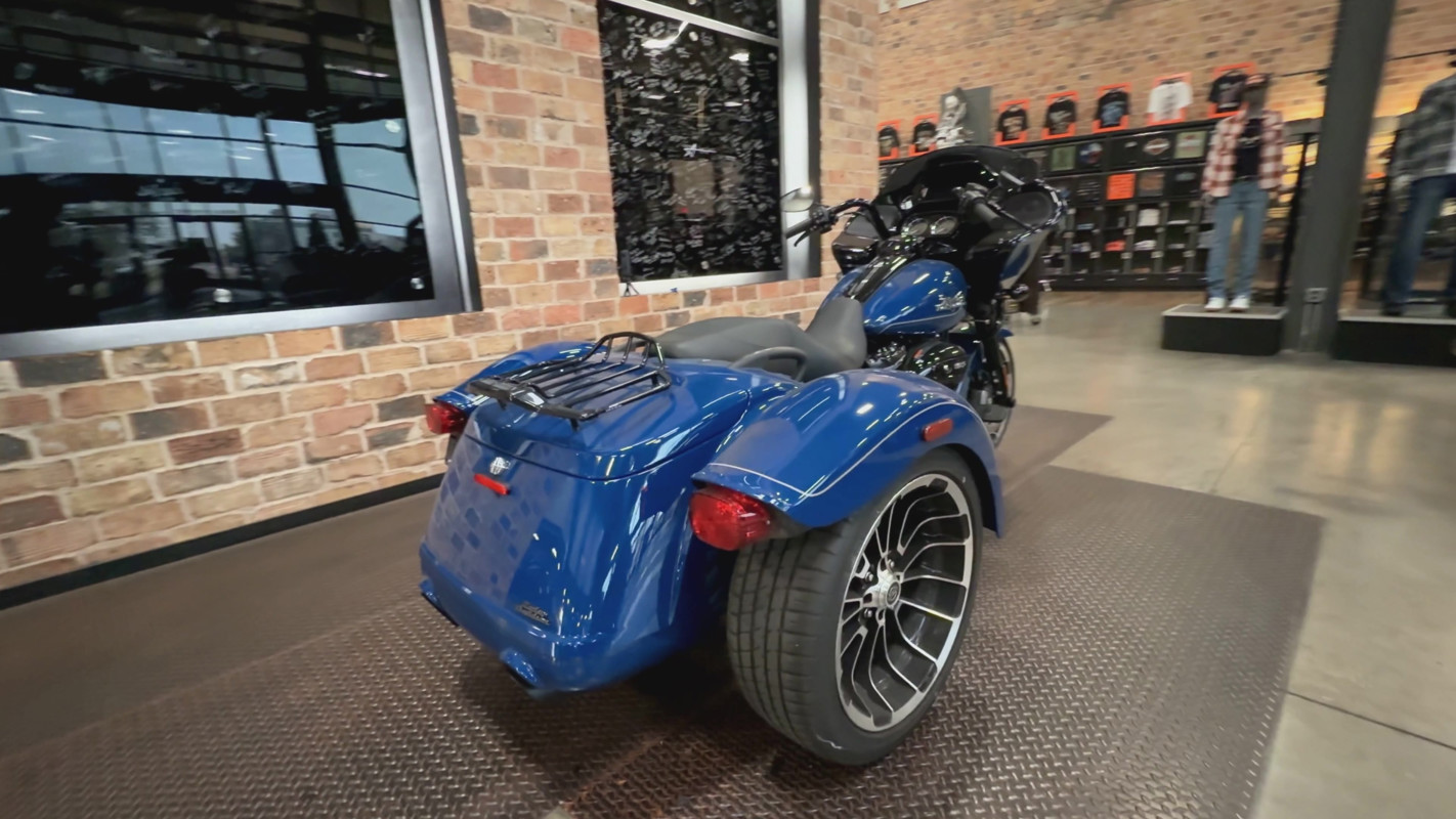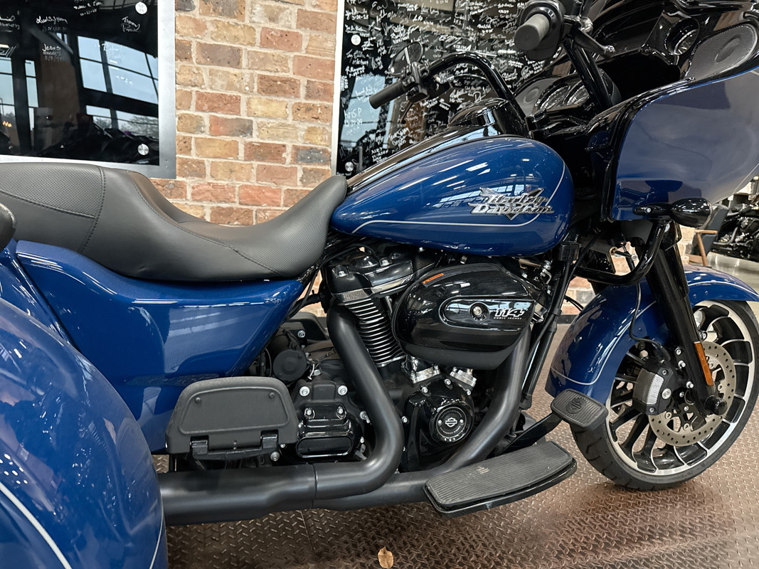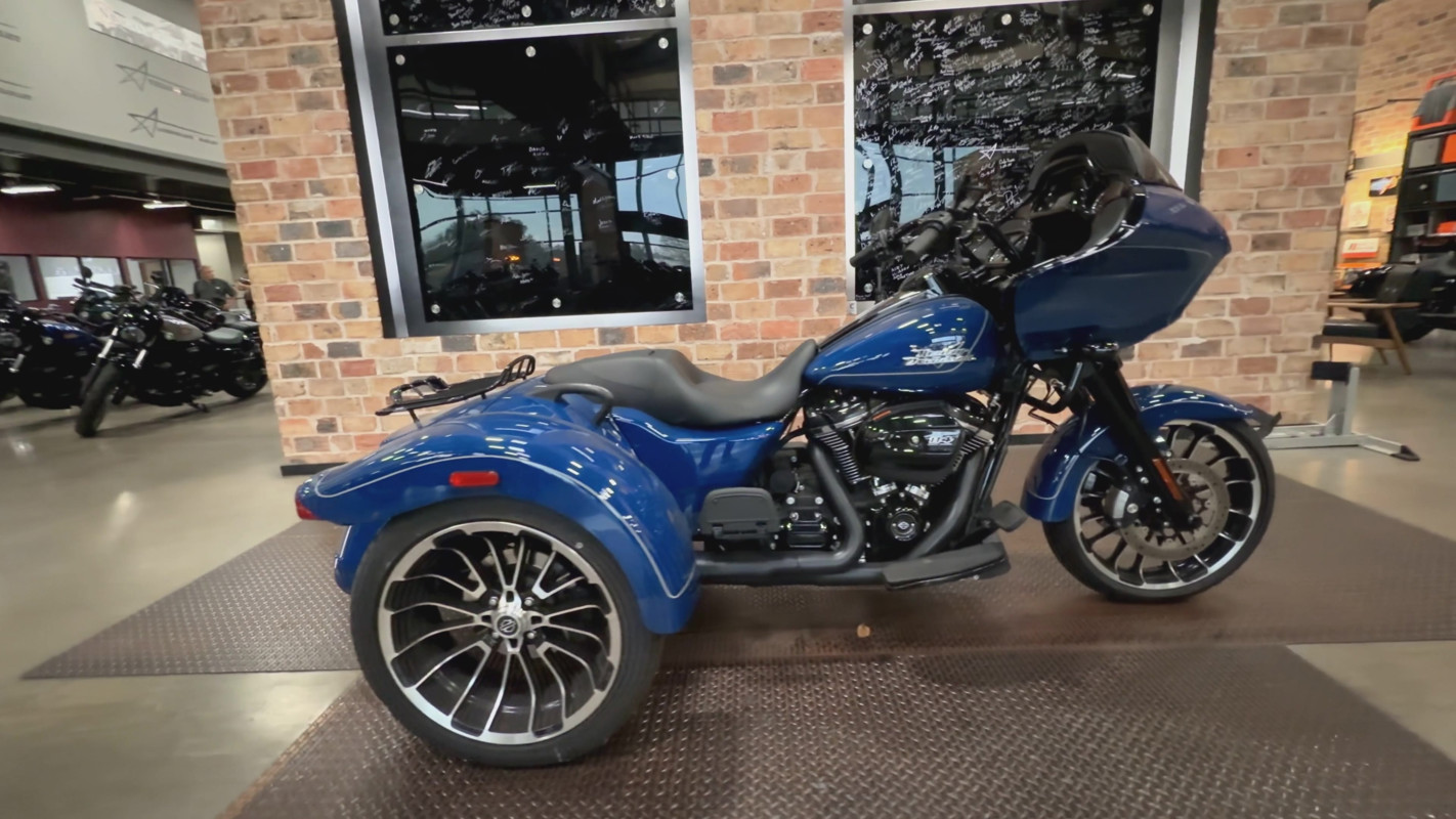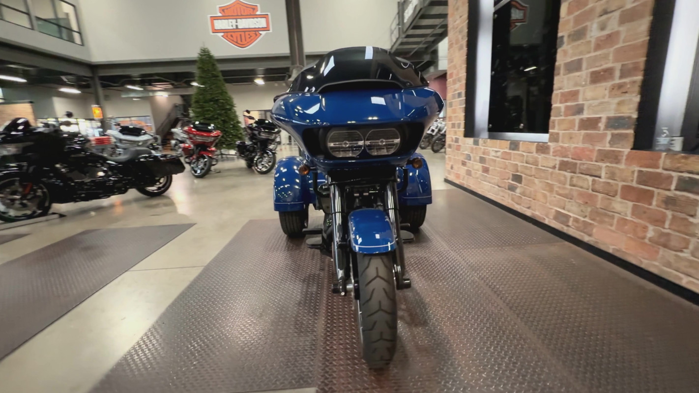 The exterior of the Road Glide 3 is finished in a captivating BRT Biliard Blu color, which adds a touch of elegance and sophistication to its robust appearance. The trike's design is both bold and aerodynamic, featuring the iconic Harley-Davidson styling cues that enthusiasts have come to love. The black accents and 8-spoke bright ABS wheels further enhance its visual appeal, giving it a modern and aggressive look.