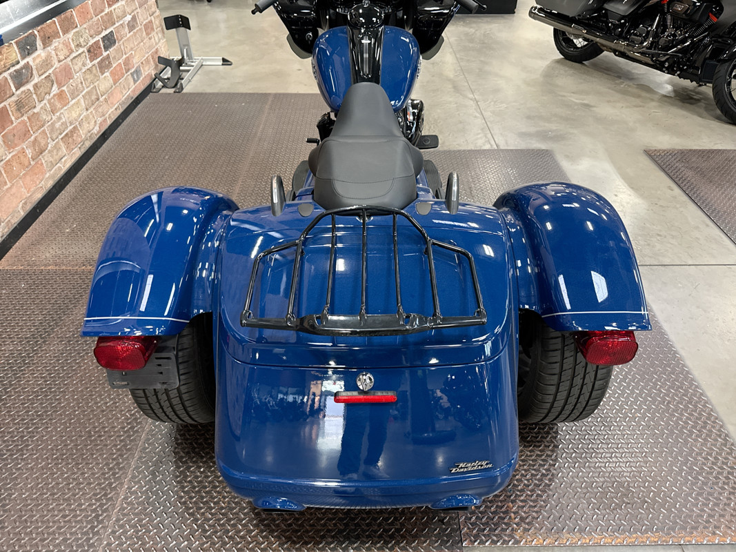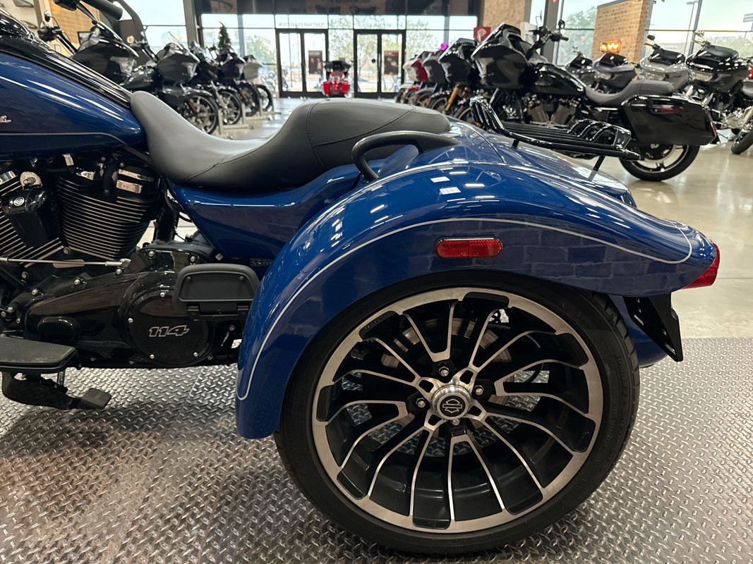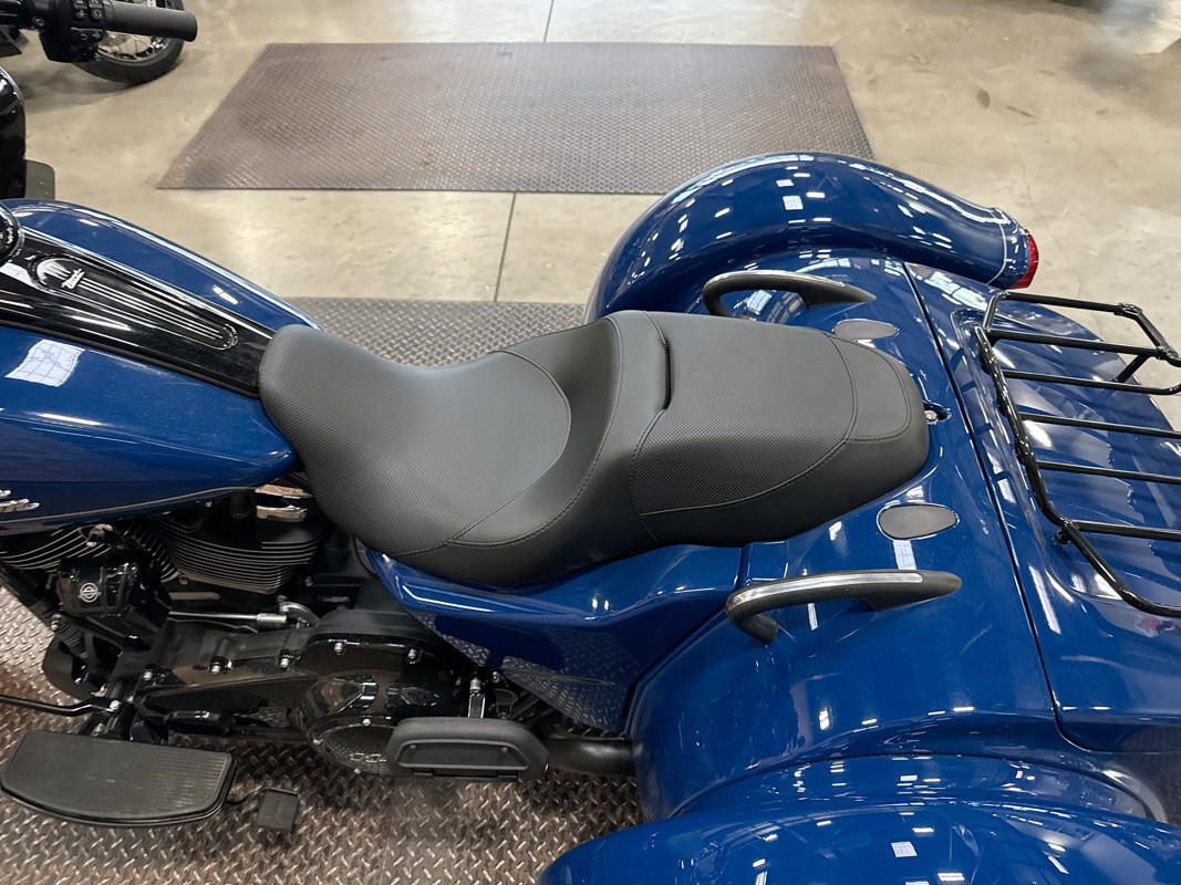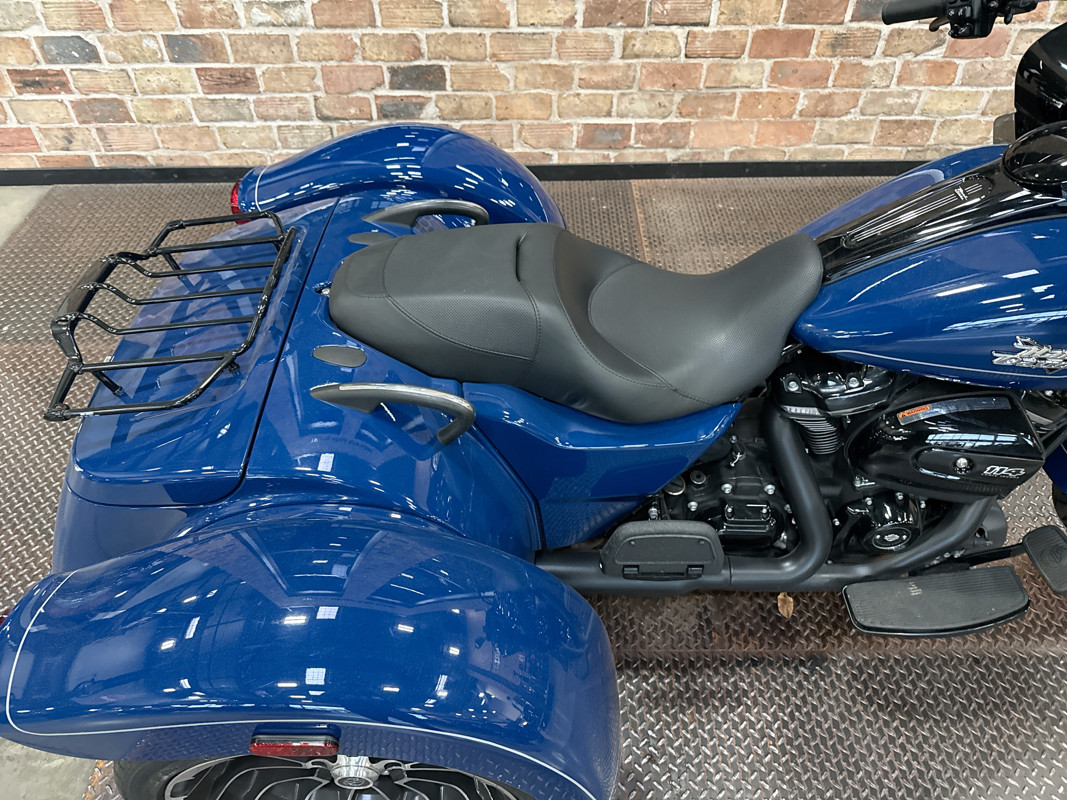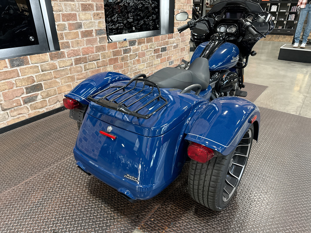 The exterior of the Road Glide 3 is finished in a captivating BRT Biliard Blu color, which adds a touch of elegance and sophistication to its robust appearance. The trike's design is both bold and aerodynamic, featuring the iconic Harley-Davidson styling cues that enthusiasts have come to love. The black accents and 8-spoke bright ABS wheels further enhance its visual appeal, giving it a modern and aggressive look.