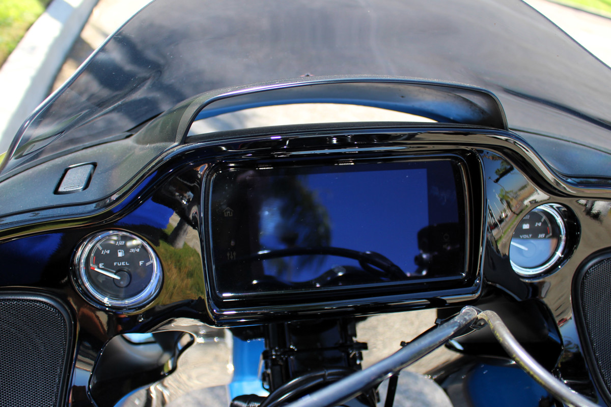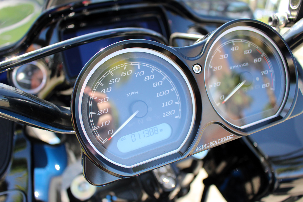 Custom risers and bars with gauge relocation – aggressive stance and improved ergonomics.