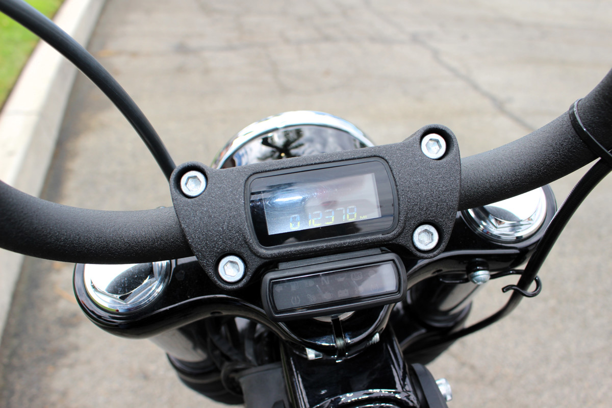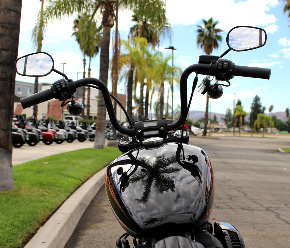 Stripped-down bobber style – mini-ape handlebars, chopped fenders, and blacked-out finishes.