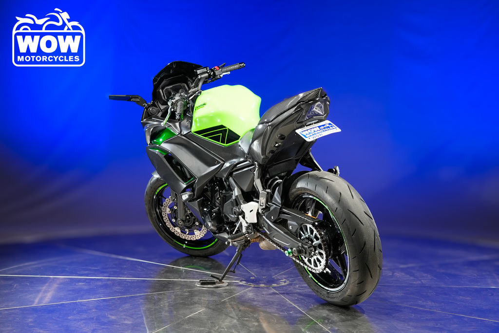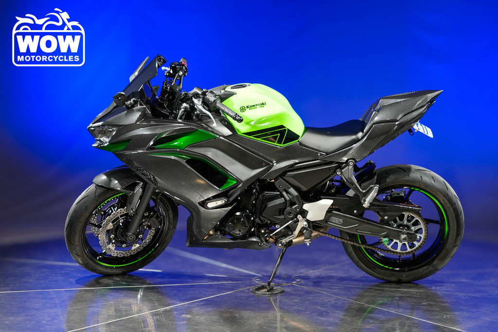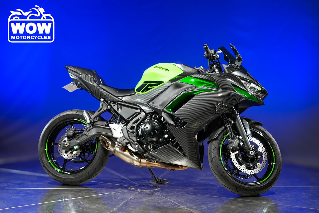 2023 KAWASAKI EX650 ABS KRT,Introducing the 2023 Kawasaki Ninja 650 ABS KRT, featuring sleek, angular bodywork draped over a lightweight, sporty trellis frame and a responsive parallel twin engine that delivers uncompromising middleweight Ninja motorcycle performance and style while maintaining everyday versatility. Reinvigorated in 2020 to further embody Ninja sportbike lineage, the Ninja 650 comes packed with a sporty 649cc engine, next-level technology advancements, and sharp styling. Unmistakable sport performance is met with an upright riding position for exciting daily commutes, while a supreme level of attitude reminds you of its legendary heritage. Maintaining the “Fun, Style, Easy? concept of its predecessor, the superbly balanced and extremely exciting Ninja 650 features a 650cc Parallel Twin engine with a strong low-mid range focus and a lightweight chassis in a slim, middleweight package. Engine refinements contribute to cleaner emissions and increased mid-range torque, and new tyres offer lighter handling. Sharp new styling, highlighted by new LED headlights and TFT colour instrumentation, delivers a sportier appearance and even stronger Ninja family looks. Built to embody Ninja sportbike lineage, the Ninja 650 motorcycle comes packed with a sporty 649cc engine, next-level technology, and sharp styling. Unmistakable sport performance is met with an upright riding position for exciting daily commutes, while a supreme level of attitude reminds you of its legendary heritage. Key features include aggressive Ninja motorcycle styling with twin LED headlights, TFT color instrumentation, a fuel-efficient twin-cylinder engine that delivers smooth power, a lightweight trellis frame for agile and sporty handling, a comfortable passenger seat, Dunlop Sportmax Roadsport 2 tires, Kawasaki Genuine Accessories available separately, and an exclusive Kawasaki Racing Team (KRT) color and graphics. For 2023, the Ninja 650 receives Kawasaki TRaction Control (KTRC), an advanced traction control system that provides enhanced sport riding performance and peace of mind under certain conditions, with two modes to suit riding situations—Mode 1 for minimal intrusion during cornering and Mode 2 for earlier intervention in low-traction scenarios, plus an option to turn it off. The Ninja 650 features a tried-and-true 649cc parallel-twin engine perfect for daily commutes or winding back roads, a lightweight chassis for smooth and agile handling, sharp styling that catches attention, 4.3-inch all-digital TFT color instrumentation for premium feel and visibility, twin LED headlights with low and high beam plus position lamp, and smartphone connectivity through RIDEOLOGY THE APP for accessing, logging, and reviewing functions to enhance the motorcycling experience. Engine: 649cc, liquid-cooled, 4-stroke, DOHC 8-valve parallel twin; Bore x Stroke: 83.0 x 60.0 mm; Compression Ratio: 10.8:1; Fuel System: Fuel injection: ø36 mm x 2 with dual throttle valves; Ignition: Digital; Starting: Electric; Lubrication: Forced lubrication, semi-dry sump; Maximum Power: 50.2 kW {68 PS} / 8,000 rpm; Maximum Torque: 64 N•m {6.5 kgf•m} / 6,700 rpm; Transmission: 6-speed, return; Clutch: Wet multi-disc, manual; Final Drive: Sealed chain; Primary Reduction Ratio: 2.095 (88/42); Gear Ratios 1st: 2.438 (39/16); Gear Ratios 2nd: 1.714 (36/21); Gear Ratios 3rd: 1.333 (32/24); Gear Ratios 4th: 1.111 (30/27); Gear Ratios 5th: 0.966 (28/29); Gear Ratios 6th: 0.852 (23/27); Final Reduction Ratio: 3.067 (46/15). Frame: Trellis, high-tensile steel; Front Suspension / Wheel Travel: ø41 mm telescopic fork / 125 mm (4.9 in); Rear Suspension / Wheel Travel: Horizontal Back-link, single-shock with adjustable spring preload / 130 mm (5.1 in); Rake / Trail: 24.0° / 100 mm; Steering Angle (L/R): 32° / 32°; Front Tire: 120/70ZR17M/C (58W); Rear Tire: 160/60ZR17M/C (69W); Front Brakes: Dual semi-floating ø300 mm petal discs with dual-piston calipers; Rear Brake: ø220 mm pe