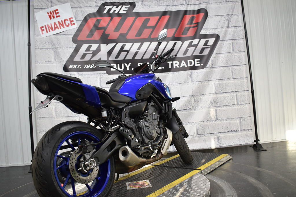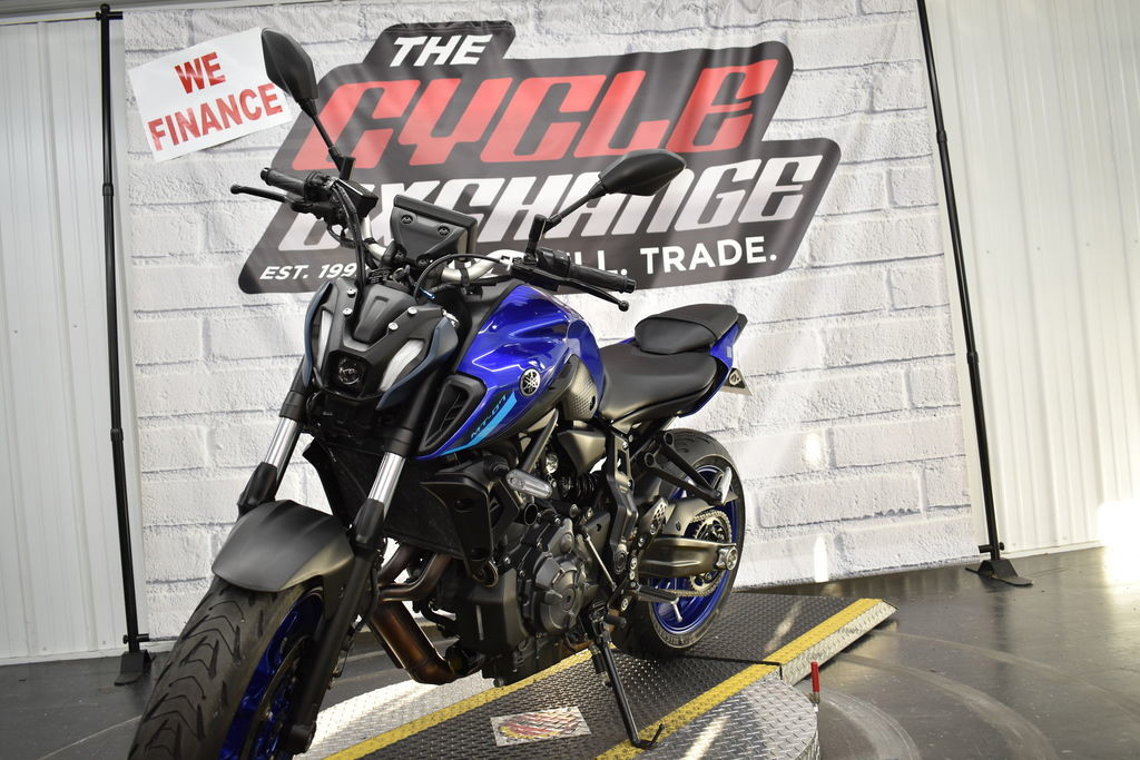 The MT-07's aggressive look further enhances its distinctive appeal. Bold colors and graphics integrate with the minimalist stripped-back design and structural elements to emphasize pure Hyper Naked character. With a silhouette that is synonymous with the MT Series' signature statement of torque and power, the MT-07 showcases a tight, compact and powerful appearance.