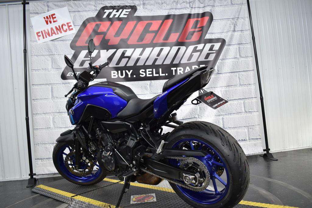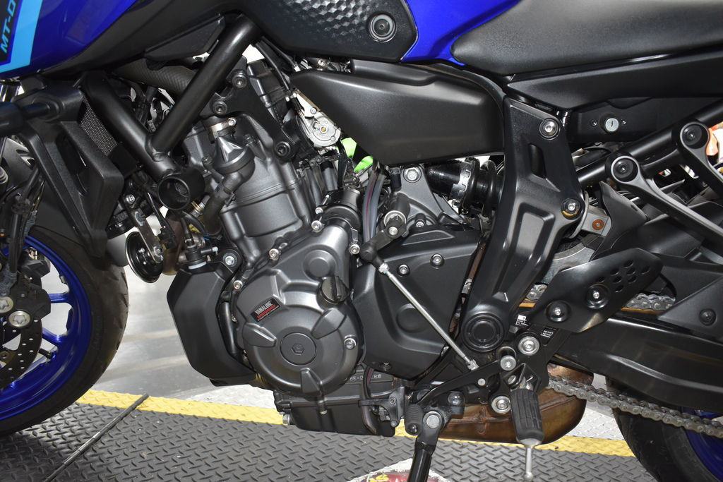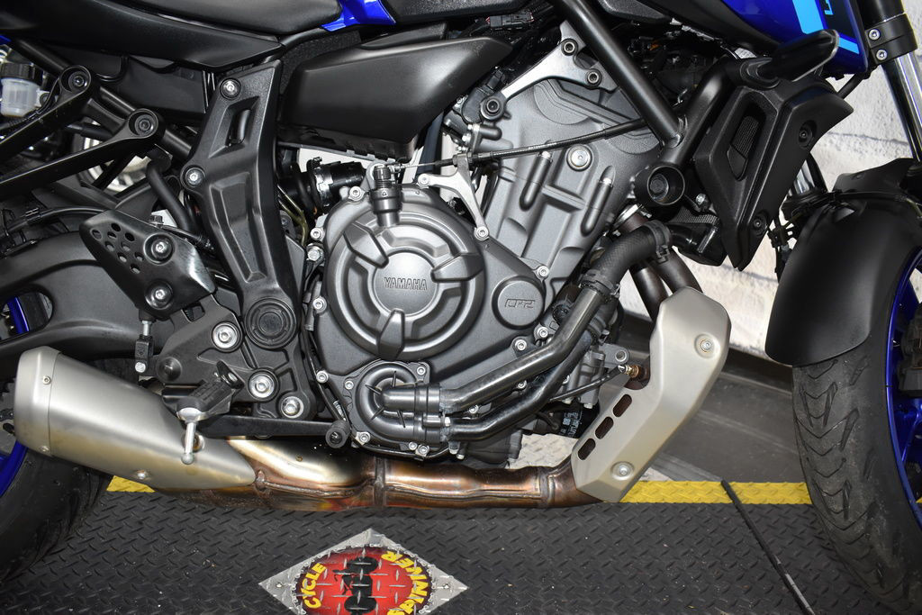 The MT-07 features the compact 689cc liquid-cooled, inline twin cylinder, DOHC CP2 engine with fuel injection. The fun and characterful CP2 engine provides both outstanding low- to mid-range torque and strong high-rpm pulling power. Fuel injection settings are optimized for seamless, linear throttle response characteristics, even when the throttle is slightly open at low rpm.