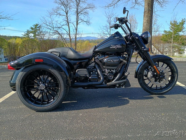 2025 Harley-Davidson® Freewheeler®Features may include: DESIGN Mini-Ape Handlebars Tall handlebars put the rider in a powerful and commanding stance, with iconic style and a range of adjustability for height and reach. Blacked-Out Styling Blacked-out finishes start at the front wheel and carry through the forks, dashboard, powertrain, and exhaust system. Storage Fit a pair of helmets side by side and still have extra room in the trunk that opens from right to left for easy loading, with a weatherproof, locking lid to keep all your goods safe and secure. Rear Fenders Bobtail fenders add a bit of traditional H-D flare to the Freewheeler’s rear end. Seat with Passenger Grab Handles Two-up seat features soft-touch grab handles for added passenger stability and confidence.PERFORMANCE Milwaukee-Eight® 114 Engine The Milwaukee-Eight® V-twin engine has plenty of power for easy highway cruising, effortless passing, and eye-watering acceleration. Front Suspension Dual-bending valve front suspension is plush and soft on the highway, but firm enough to maintain composure during hard riding. Rear Suspension Rear suspension features a quick-adjust preload knob to tune performance when adding a passenger or loading up the trunk. Slash-Down Dual Mufflers Dual mufflers with slash-down tips between the rear wheels deliver a classic hot rod style.INNOVATION Rider Safety Enhancements Keep your feet up, flip into Electric Reverse, and back into that parking spot with ease and minimal effort.
