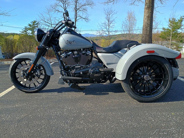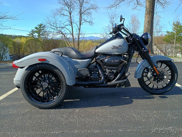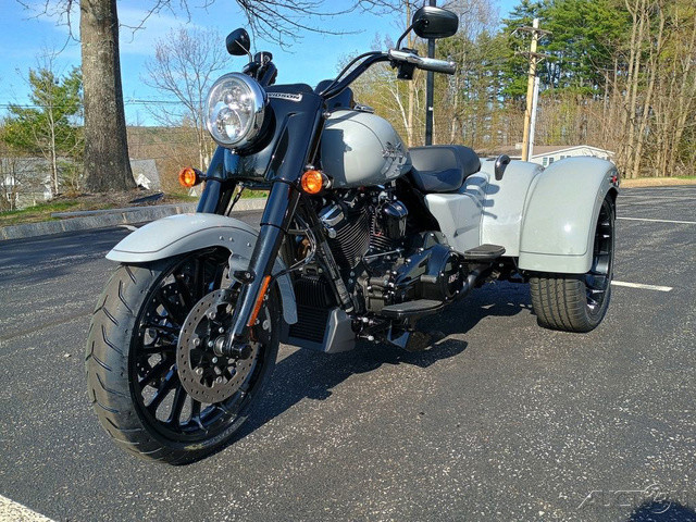 2025 Harley-Davidson® Freewheeler®Features may include: DESIGN Mini-Ape Handlebars Tall handlebars put the rider in a powerful and commanding stance, with iconic style and a range of adjustability for height and reach. Blacked-Out Styling Blacked-out finishes start at the front wheel and carry through the forks, dashboard, powertrain, and exhaust system. Storage Fit a pair of helmets side by side and still have extra room in the trunk that opens from right to left for easy loading, with a weatherproof, locking lid to keep all your goods safe and secure. Rear Fenders Bobtail fenders add a bit of traditional H-D flare to the Freewheeler’s rear end. Seat with Passenger Grab Handles Two-up seat features soft-touch grab handles for added passenger stability and confidence.PERFORMANCE Milwaukee-Eight® 114 Engine The Milwaukee-Eight® V-twin engine has plenty of power for easy highway cruising, effortless passing, and eye-watering acceleration. Front Suspension Dual-bending valve front suspension is plush and soft on the highway, but firm enough to maintain composure during hard riding. Rear Suspension Rear suspension features a quick-adjust preload knob to tune performance when adding a passenger or loading up the trunk. Slash-Down Dual Mufflers Dual mufflers with slash-down tips between the rear wheels deliver a classic hot rod style.INNOVATION Rider Safety Enhancements Keep your feet up, flip into Electric Reverse, and back into that parking spot with ease and minimal effort.