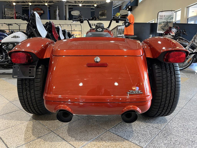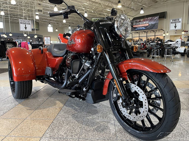 2025 Harley-Davidson® Freewheeler®Features may include: DESIGN Mini-Ape Handlebars Tall handlebars put the rider in a powerful and commanding stance, with iconic style and a range of adjustability for height and reach. Blacked-Out Styling Blacked-out finishes start at the front wheel and carry through the forks, dashboard, powertrain, and exhaust system. Storage Fit a pair of helmets side by side and still have extra room in the trunk that opens from right to left for easy loading, with a weatherproof, locking lid to keep all your goods safe and secure. Rear Fenders Bobtail fenders add a bit of traditional H-D flare to the Freewheeler’s rear end. Seat with Passenger Grab Handles Two-up seat features soft-touch grab handles for added passenger stability and confidence.PERFORMANCE Milwaukee-Eight® 114 Engine The Milwaukee-Eight® V-twin engine has plenty of power for easy highway cruising, effortless passing, and eye-watering acceleration. Front Suspension Dual-bending valve front suspension is plush and soft on the highway, but firm enough to maintain composure during hard riding. Rear Suspension Rear suspension features a quick-adjust preload knob to tune performance when adding a passenger or loading up the trunk. Slash-Down Dual Mufflers Dual mufflers with slash-down tips between the rear wheels deliver a classic hot rod style.INNOVATION Rider Safety Enhancements Keep your feet up, flip into Electric Reverse, and back into that parking spot with ease and minimal effort.