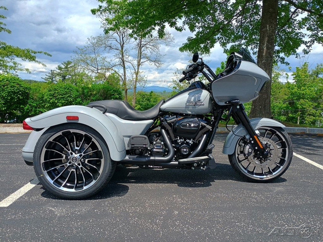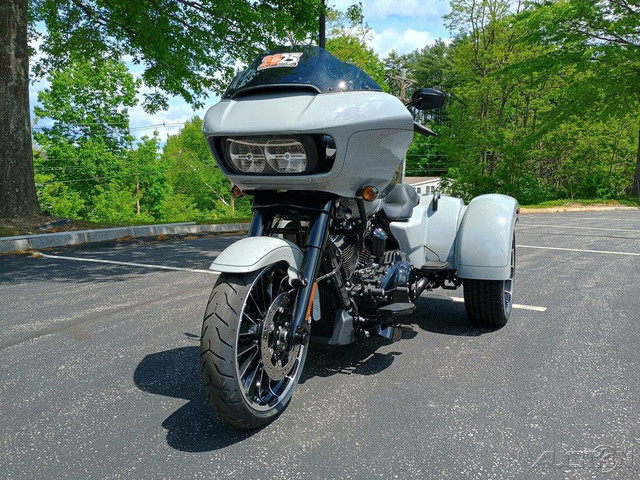 2025 Harley-Davidson® Road Glide® 3Features may include:DESIGNThe iconic Road Glide, known for its classic Sharknose bagger design, blends tradition with modern comfort and connectivity, featuring advanced engineering and a suite of intuitive technologies.FairingFeaturing the iconic Sharknose fairing, Dual Daymaker® LED headlamps, full infotainment system with internal speakers, and triple splitstream vents for enhanced comfort at highway speeds.WheelsWith 19-inch front wheel and 18-inch rear wheels, the Road Glide 3 has a powerful and commanding stance with ample ground clearance, and the comfort of a low, 26.5-inch seat height.Comfort SeatLong-mile comfort for rider and passenger alike, with soft-touch grab handles for an added level of passenger security.Rear FendersFlared bobtail rear fenders over 18-inch wheels add even more attitude to the Road Glide 3’s already powerful presenceStorageThe weatherproof and locking trunk has two cubic feet of storage and a top-mounted door for easy loading and unloading.Premium PaintA wide variety of premium paint options let you match your style and personality, including an all-new Factory Custom Whiskey Firestorm paint scheme, with brilliant and bright contrasting flames.PERFORMANCEMilwaukee-Eight® 114 EngineThe iconic thump and incredible torque of Milwaukee-Eight® 114 V-twin power, tuned for trike performance and delivered to two 18-inch rear wheels for impressive acceleration power.Rear SuspensionQuickly tune rear suspension for added payload with single-knob preload adjustment to ensure comfortable and composed performanceSlash-Down Dual MufflersDual mufflers with slash-down tips between the rear wheels deliver a classic hot rod style.INNOVATION6.5-Inch Touchscreen DisplayEasy-to-use touchscreen infotainment system helps you quickly choose music, tune Rider Safety Enhancements, and more.AudioBold, clear audio whether you’re cruising around town or blasting down the highway, easily managed through intuitive hand controls and the touchscreen display.