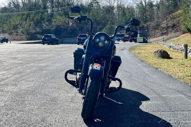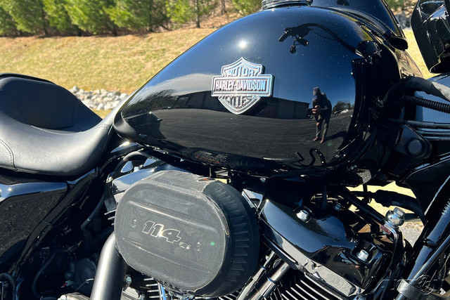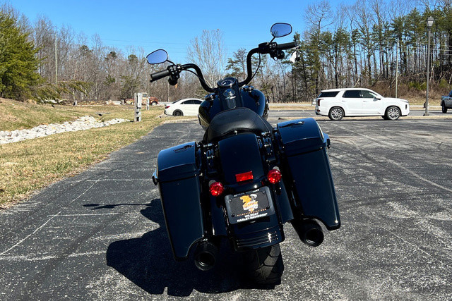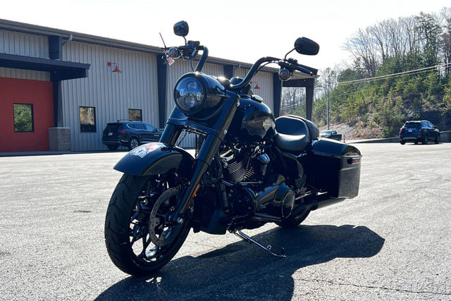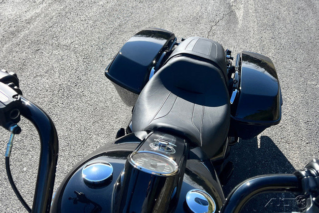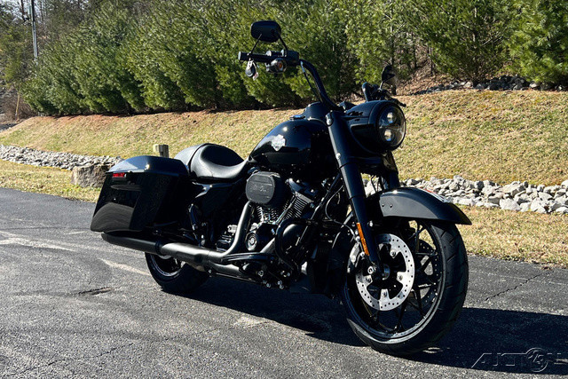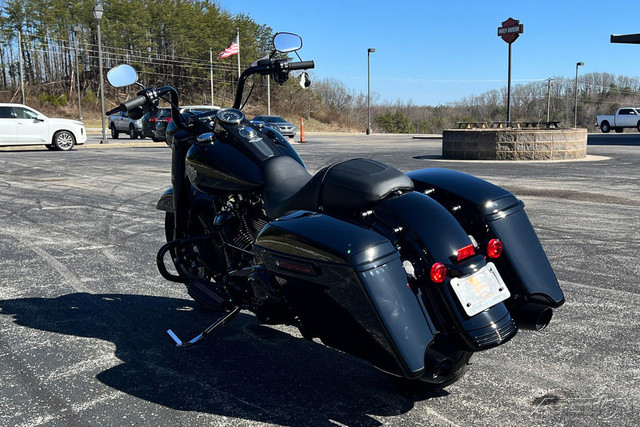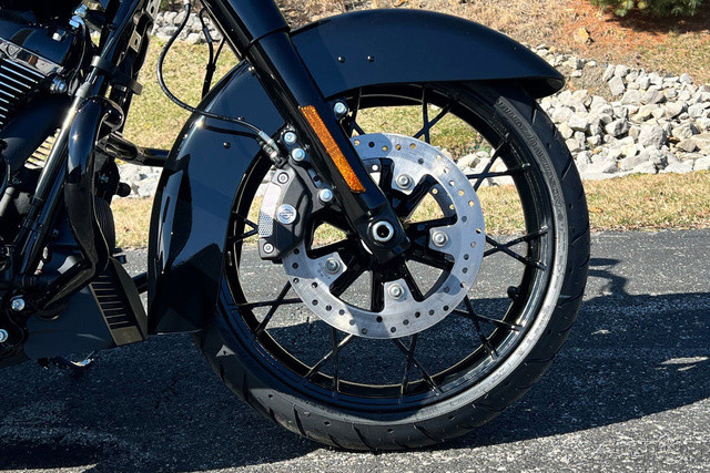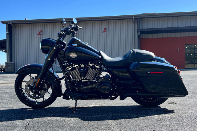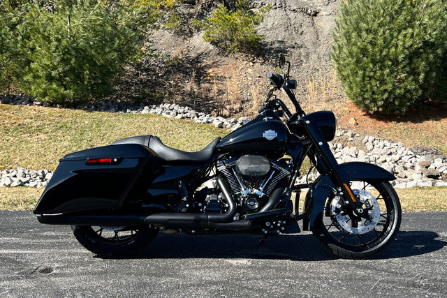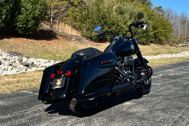 2025 Harley-Davidson® Road King® SpecialFeatures may include:DESIGNThe stripped-down bagger silhouette with stretched bags, deep black finishes, and comfortably commanding ergonomics.Blacked-Out StylingBlacked-out powertrain is built with a mixture of gloss and matte finishes to provide depth and texture.SaddlebagsStretched saddlebags provide added storage and a smooth line that flows with the blacked-out exhaust system.Mini-Ape HandlebarsMini-Apes put the rider in an upright, commanding stance with a range of adjustability to personalize height and reach.PERFORMANCEMilwaukee-Eight® power optimized with a high-performance air cleaner and a high-flowing, two-into two exhaust, backed by high-performance Brembo brakes and SHOWA® suspension.Milwaukee-Eight® 114 V-Twin EngineAs versatile as it is powerful, the Milwaukee-Eight® 114 V-twin engine is tuned to deliver peak torque in the low revs for rapid acceleration and churn out plenty of horsepower for effortless highway cruising.Brembo BrakesIncredible stopping power with direct feel at the lever and pedal, thanks to top-shelf braking components developed with Brembo.High-Performance Air CleanerHigh-performance ribbed air cleaner with an exposed filter allows more air to pass through, improving engine response and performance.INNOVATIONSet your speed and relax with easily managed Cruise Control as a standard feature.