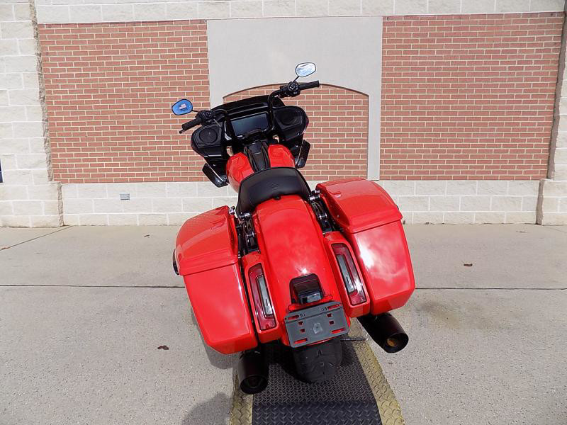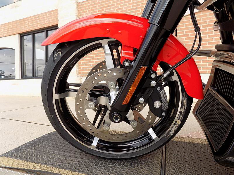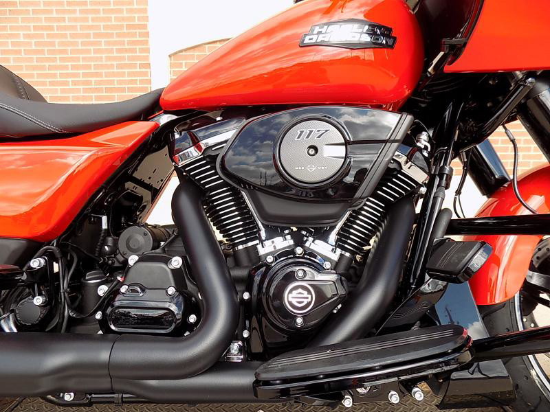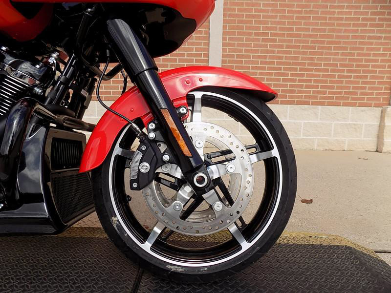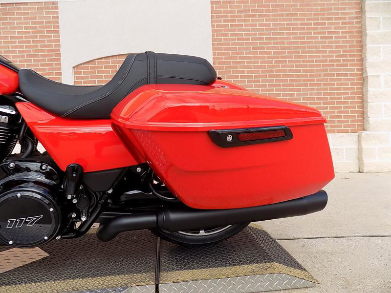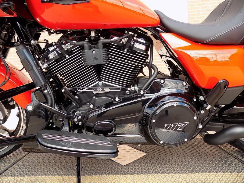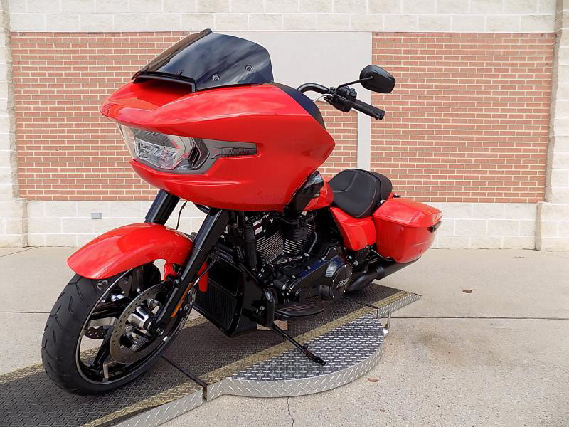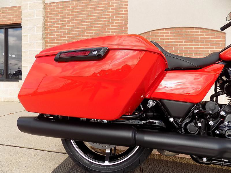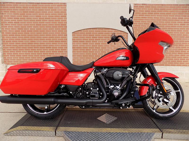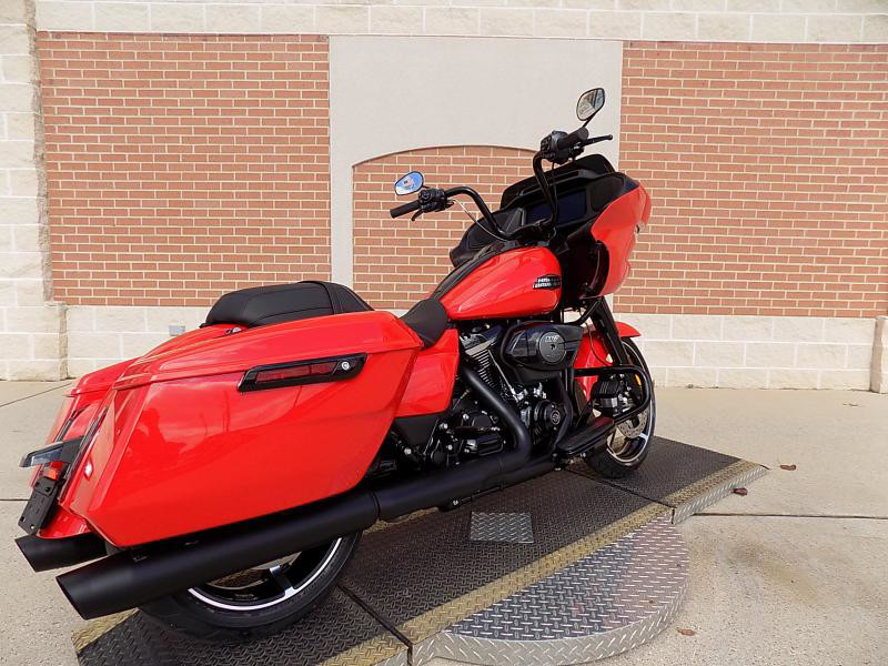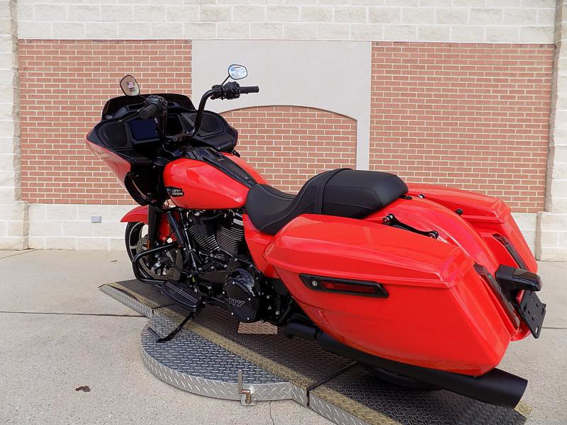 The Road Glide Touring model in BLOOD ORANGE is not just about looks; it's built for those who seek adventure and crave long rides. Its sleek design and dynamic color are complemented by the striking BLACK accents and signature Harley-Davidson detailing. The 5 SPK CAST ABS wheels not only add to its robust appearance but also ensure a smooth and safe ride.