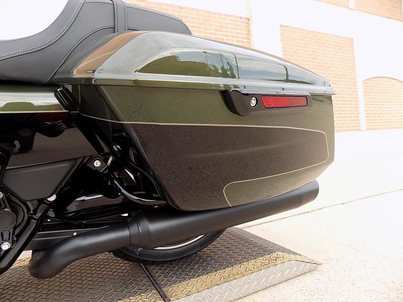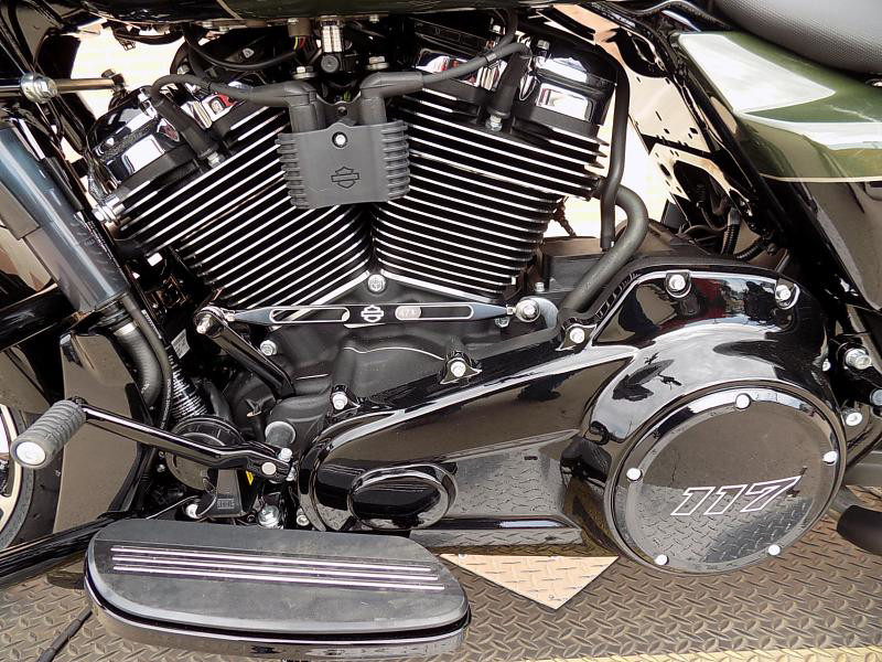 - The unique exterior color scheme of OLIV STL MTL/BLK W/ PINSTRI makes it stand out as both a modern and classic piece of machinery.