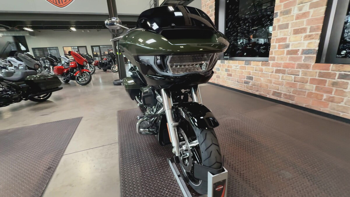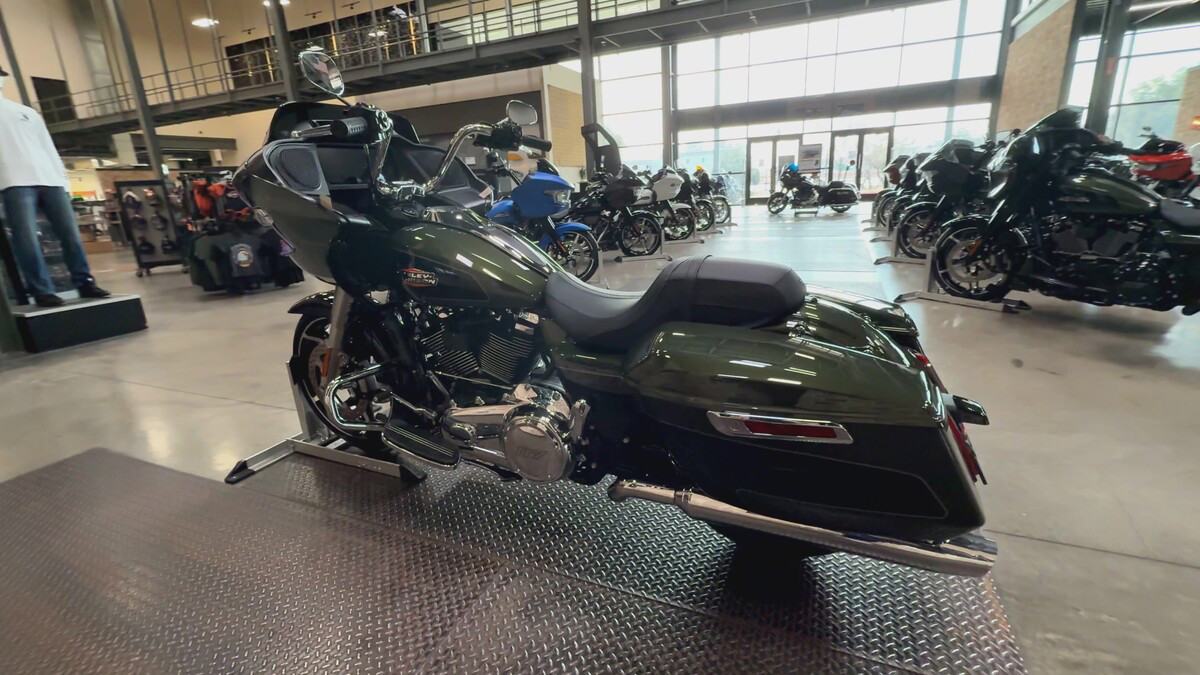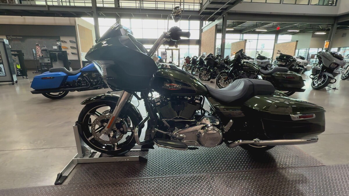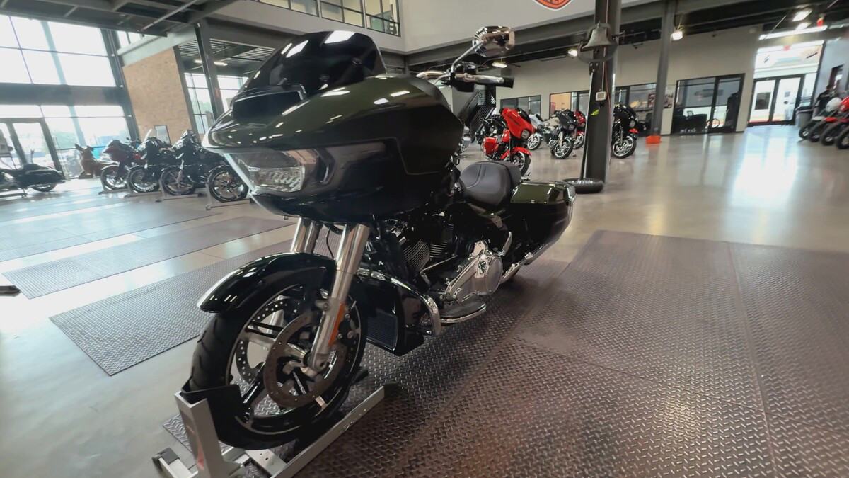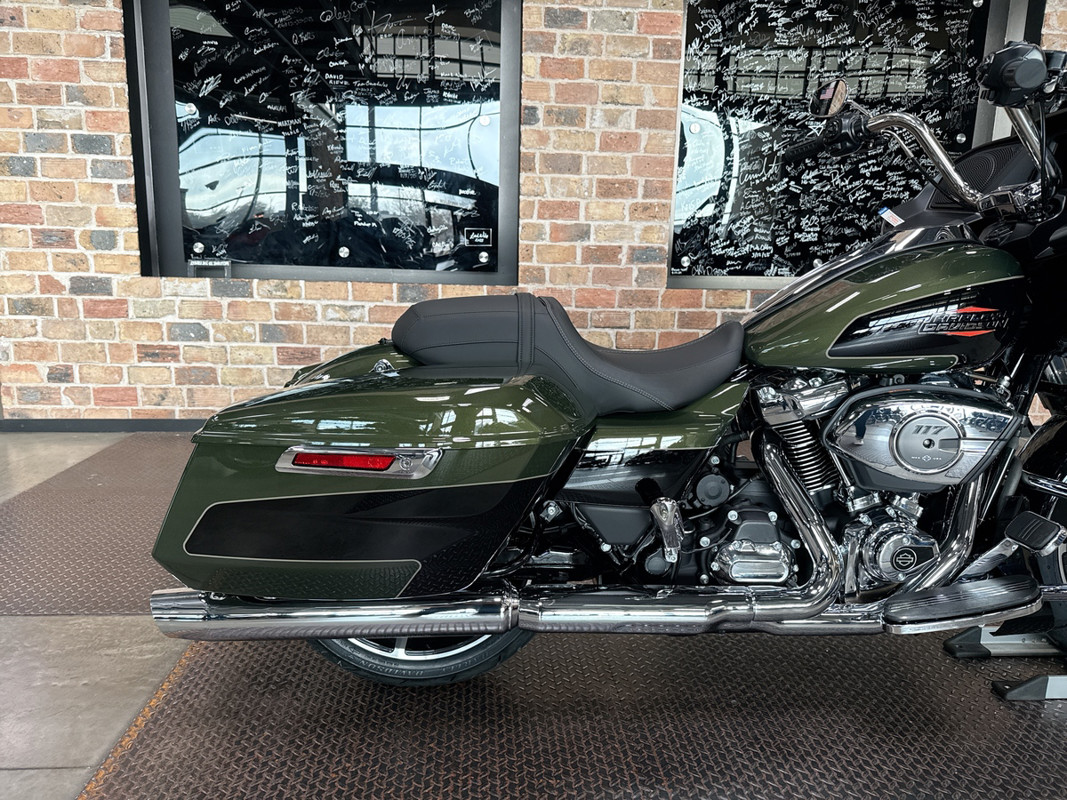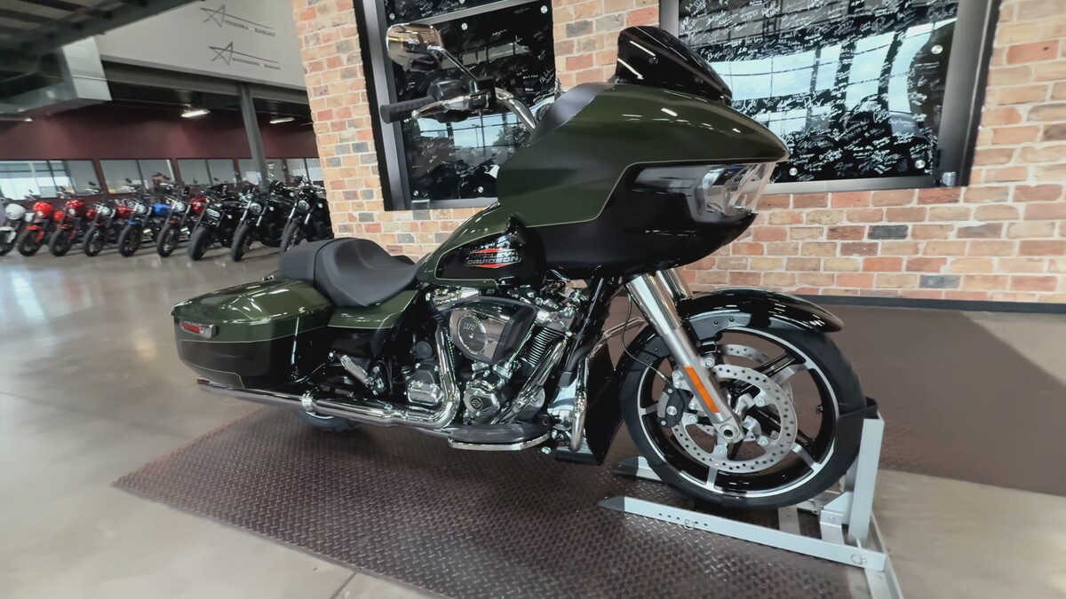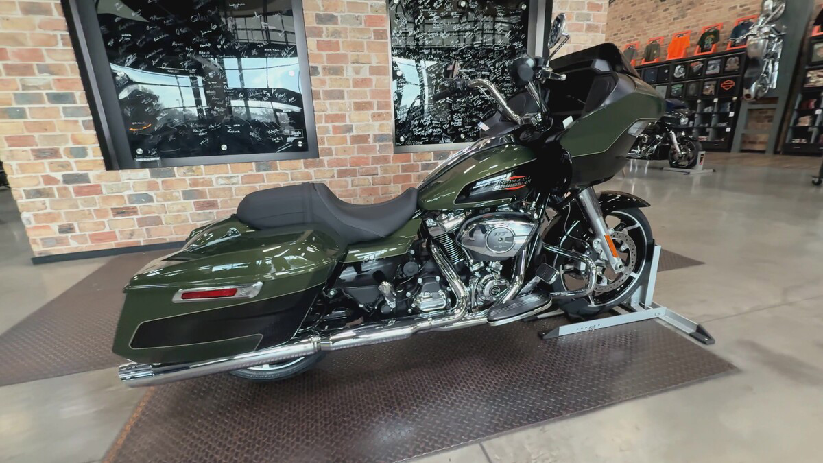 The Road Glide's striking appearance starts with its stunning exterior color, Olive Steel Metallic/Black with Pinstriping. This bold and authentic color scheme is designed to turn heads and evoke a sense of timeless classic style.