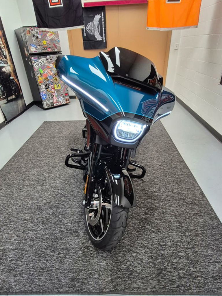 The Milwaukee-Eight 117 delivers 105 hp and 130 ft-lb. of torque, with liquid-cooled heads and a center-mounted radiator to keep both performance and rider comfortable when the temps climb, whether you’re crawling through traffic or chasing sky.